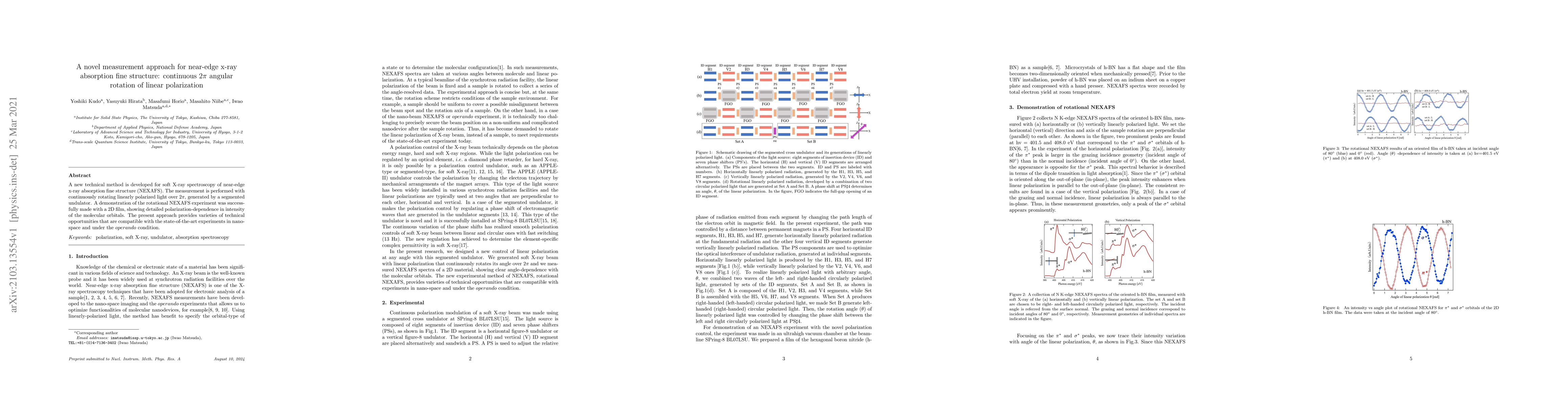 This paper introduces a novel method for soft x-ray spectroscopy using continuous 2π angular rotation of linearly polarized light generated by a segmented undulator to measure near-edge x-ray absorption fine structure (NEXAFS). The technique demonstrated polarization-dependent intensity of molecular orbitals in a 2D film, offering advanced technical compatibility for nano-scale and operando experiments.