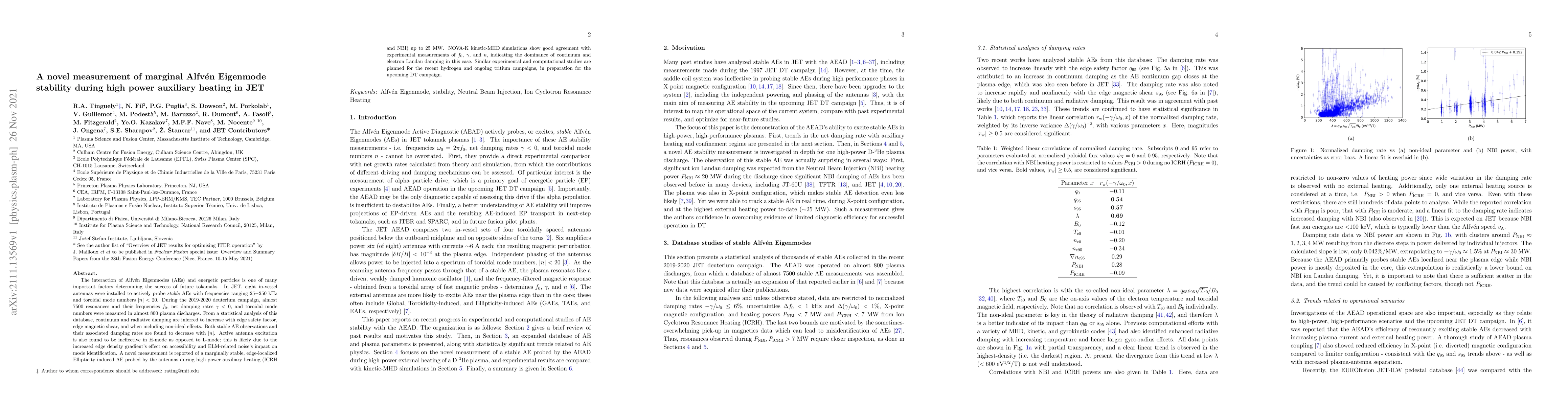 The interaction of Alfv\'{e}n Eigenmodes (AEs) and energetic particles is one of many important factors determining the success of future tokamaks. In JET, eight in-vessel antennas were installed to actively probe stable AEs with frequencies ranging 25-250 kHz and toroidal mode numbers $\vert n \vert < 20$. During the 2019-2020 deuterium campaign, almost 7500 resonances and their frequencies $f_0$, net damping rates $\gamma < 0$, and toroidal mode numbers were measured in almost 800 plasma discharges. From a statistical analysis of this database, continuum and radiative damping are inferred to increase with edge safety factor, edge magnetic shear, and when including non-ideal effects. Both stable AE observations and their associated damping rates are found to decrease with $\vert n \vert$. Active antenna excitation is also found to be ineffective in H-mode as opposed to L-mode; this is likely due to the increased edge density gradient's effect on accessibility and ELM-related noise's impact on mode identification. A novel measurement is reported of a marginally stable, edge-localized Ellipticity-induced AE probed by the antennas during high-power auxiliary heating (ICRH and NBI) up to 25 MW. NOVA-K kinetic-MHD simulations show good agreement with experimental measurements of $f_0$, $\gamma$, and $n$, indicating the dominance of continuum and electron Landau damping in this case. Similar experimental and computational studies are planned for the recent hydrogen and ongoing tritium campaigns, in preparation for the upcoming DT campaign.