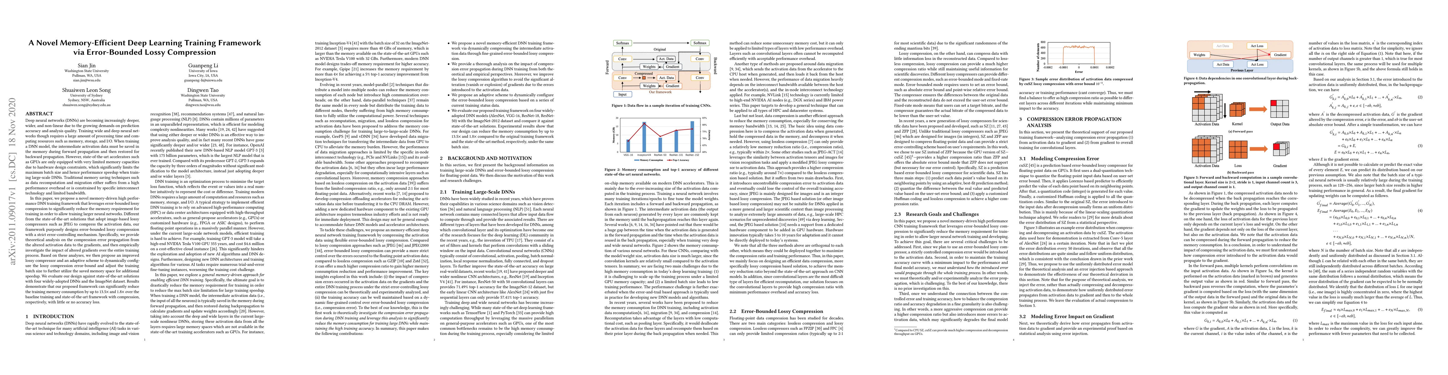 This paper proposes a memory-efficient deep learning training framework using error-bounded lossy compression to reduce memory requirements during training of large DNNs. The framework includes an improved lossy compressor and adaptive error-bound adjustment, achieving up to 13.5x lower memory usage compared to baseline methods, with minimal impact on accuracy.