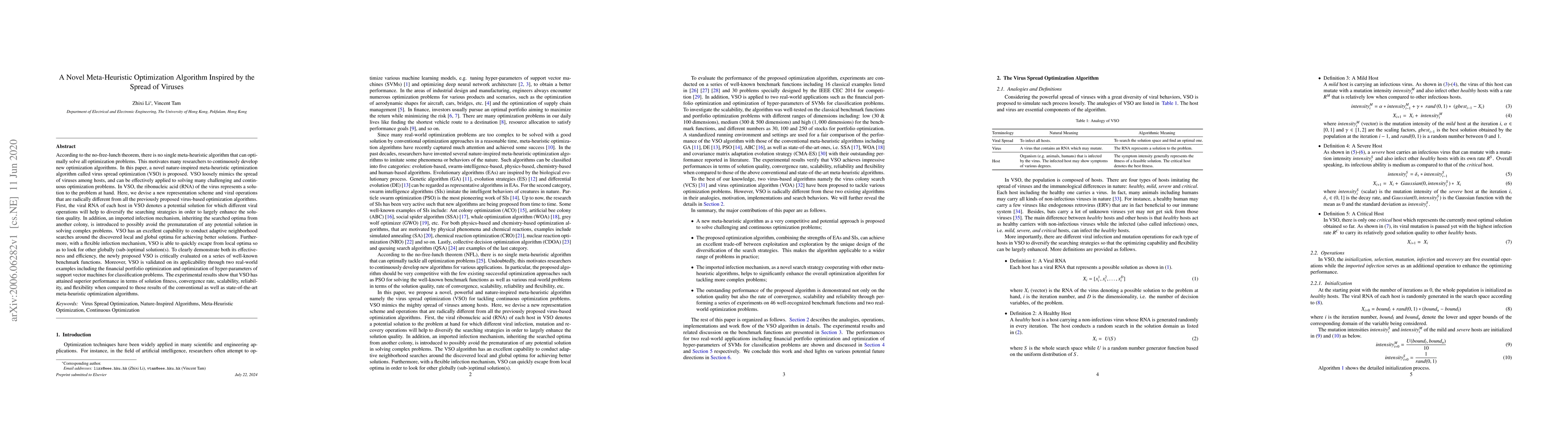 This paper proposes a novel meta-heuristic optimization algorithm called virus spread optimization (VSO), which mimics the spread of viruses among hosts to solve continuous optimization problems. VSO demonstrates superior performance in benchmark tests and real-world applications, outperforming conventional and state-of-the-art algorithms in terms of solution quality and efficiency.
