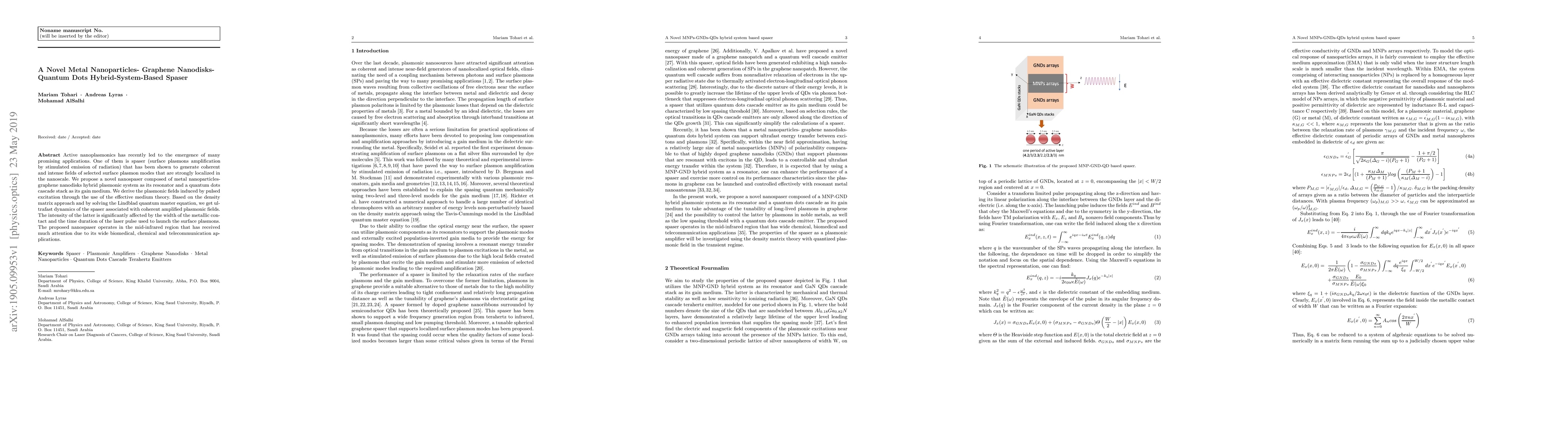 This paper introduces a novel nanospaser system using a hybrid of metal nanoparticles-graphene nanodisks and a quantum dot cascade stack, achieving coherent amplified plasmonic fields in the mid-infrared region, with significant intensity variations based on the metallic contact width and laser pulse duration.