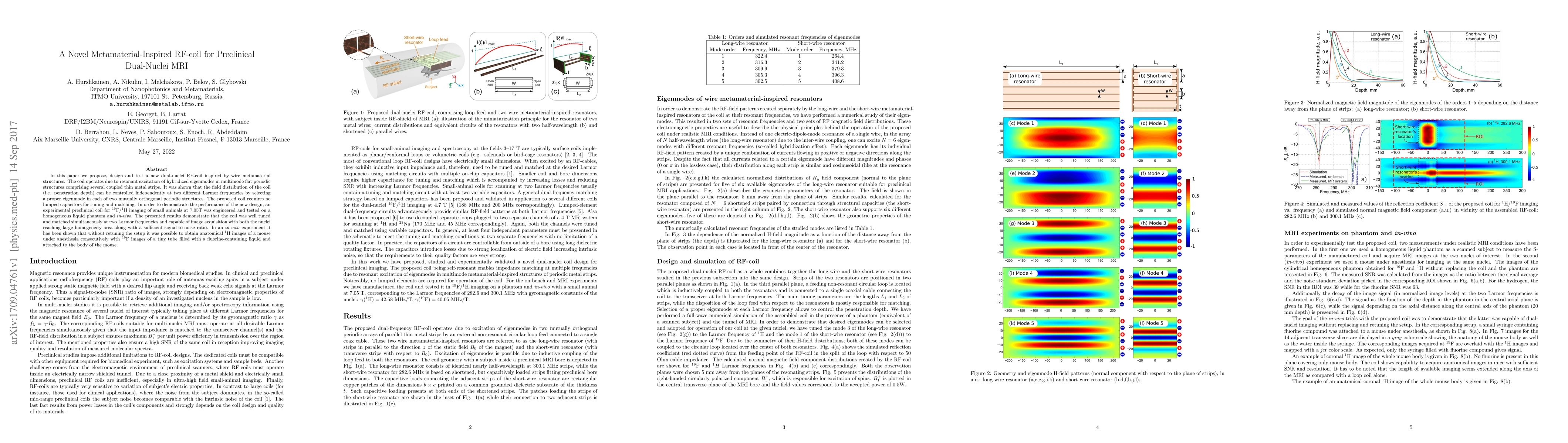 In this paper we propose, design and test a new dual-nuclei RF-coil inspired by wire metamaterial structures. The coil operates due to resonant excitation of hybridized eigenmodes in multimode flat periodic structures comprising several coupled thin metal strips. It was shown that the field distribution of the coil (i.e. penetration depth) can be controlled independently at two different Larmor frequencies by selecting a proper eigenmode in each of two mutually orthogonal periodic structures. The proposed coil requires no lumped capacitors for tuning and matching. In order to demonstrate the performance of the new design, an experimental preclinical coil for $^{19}$F/$^{1}$H imaging of small animals at 7.05T was engineered and tested on a homogeneous liquid phantom and in-vivo. The presented results demonstrate that the coil was well tuned and matched simultaneously at two Larmor frequencies and capable of image acquisition with both the nuclei reaching large homogeneity area along with a sufficient signal-to-noise ratio. In an in-vivo experiment it has been shown that without retuning the setup it was possible to obtain anatomical $^{1}$H images of a mouse under anesthesia consecutively with $^{19}$F images of a tiny tube filled with a fluorine-containing liquid and attached to the body of the mouse.