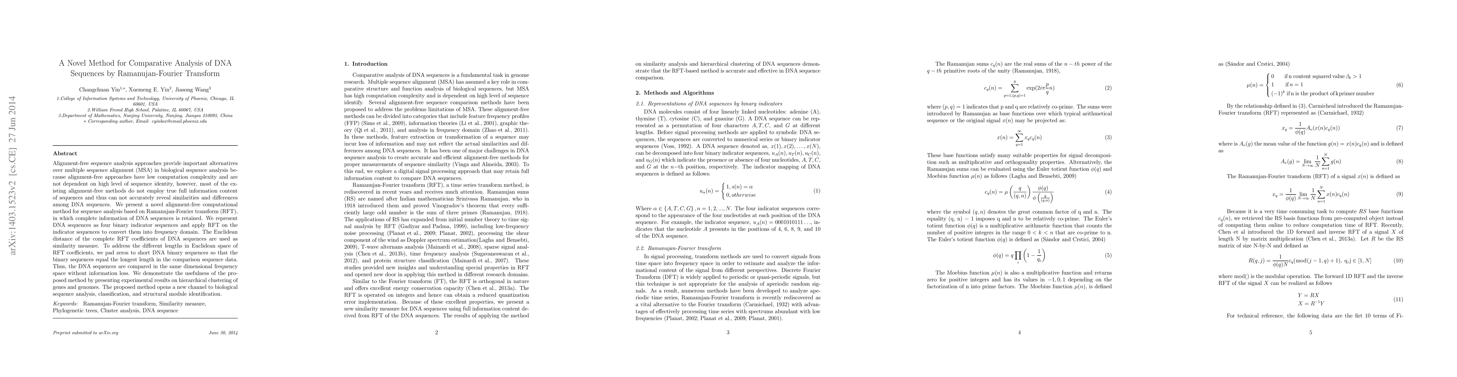 This paper introduces a novel alignment-free method for DNA sequence analysis using Ramanujan-Fourier transform (RFT) to retain full sequence information. The method converts DNA sequences into binary indicators and applies RFT to compare them in frequency space, addressing length discrepancies by padding zeros, and demonstrates its effectiveness through gene and genome clustering.