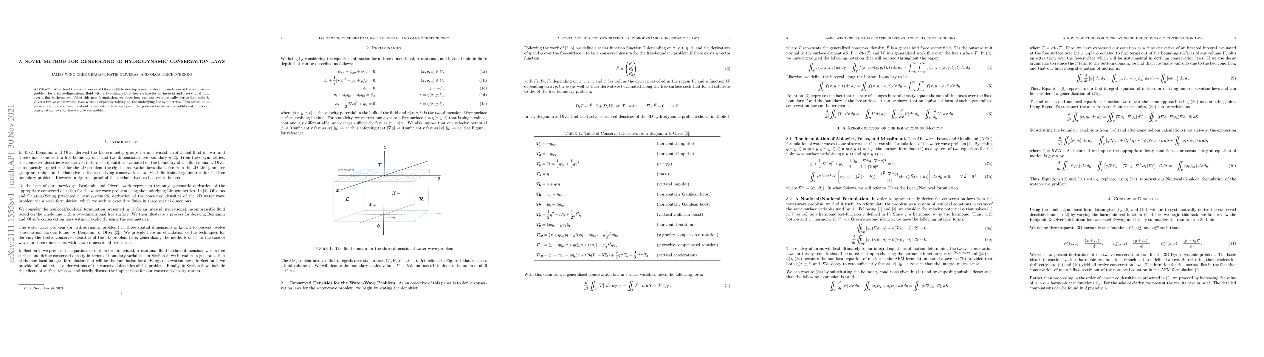 We extend the recent work of Oliveras arXiv:2008.00940 and Oliveras & Calatola-Young arXiv:2105.07580 to develop a new nonlocal formulation of the water-wave problem for a three-dimensional fluid with a two-dimensional free surface for an inviscid and irrotational fluid over a flat bathymetry. Using this new formulation, we show how one can systematically derive Benjamin & Olver's twelve conservation laws without explicitly relying on the underlying Lie symmetries. This allows us to make draw new conclusions about conservation laws and posit the potential existence of additional, nonlocal, conservation laws for the water-wave problem.