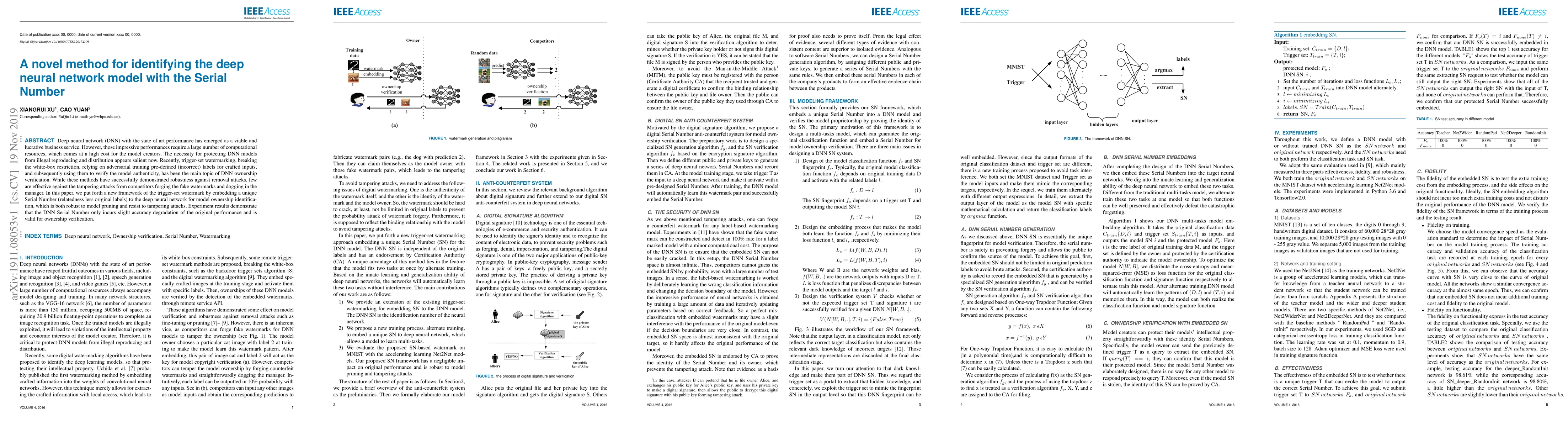 Deep neural network (DNN) with the state of art performance has emerged as a viable and lucrative business service. However, those impressive performances require a large number of computational resources, which comes at a high cost for the model creators. The necessity for protecting DNN models from illegal reproducing and distribution appears salient now. Recently, trigger-set watermarking, breaking the white-box restriction, relying on adversarial training pre-defined (incorrect) labels for crafted inputs, and subsequently using them to verify the model authenticity, has been the main topic of DNN ownership verification. While these methods have successfully demonstrated robustness against removal attacks, few are effective against the tampering attacks from competitors forging the fake watermarks and dogging in the manager. In this paper, we put forth a new framework of the trigger-set watermark by embedding a unique Serial Number (relatedness less original labels) to the deep neural network for model ownership identification, which is both robust to model pruning and resist to tampering attacks. Experiment results demonstrate that the DNN Serial Number only incurs slight accuracy degradation of the original performance and is valid for ownership verification.