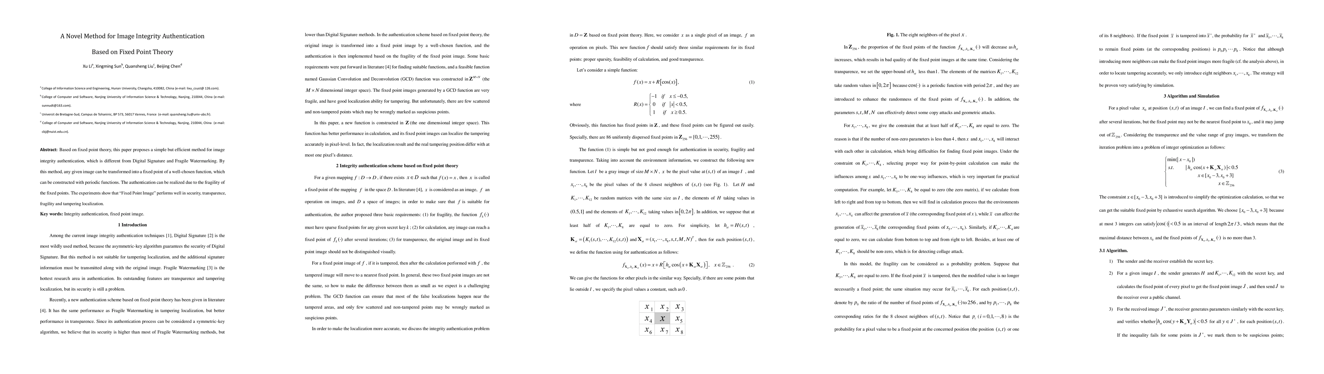 This paper introduces a novel image integrity authentication method based on fixed point theory, transforming images into fixed points of chosen functions for secure, transparent, and fragile authentication, demonstrating effective security and tampering localization.