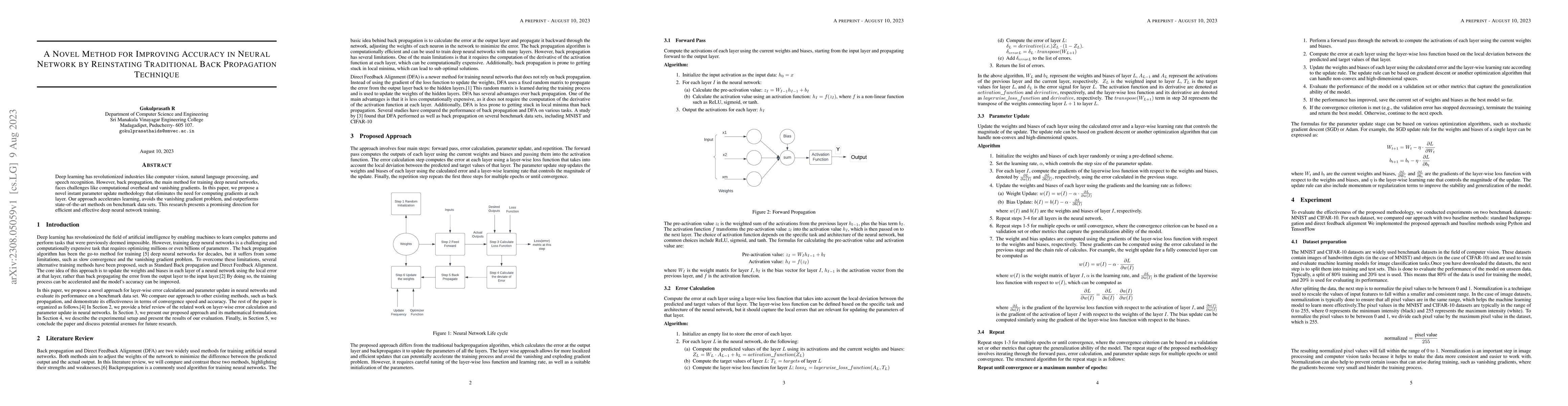 This paper proposes a novel instant parameter update method to enhance neural network training by eliminating gradient computation, addressing computational overhead and vanishing gradient issues, and achieving superior performance on benchmark datasets compared to traditional back propagation.