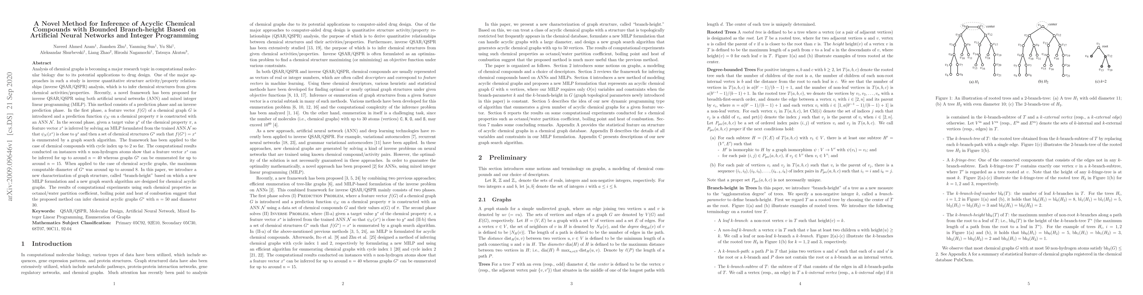 This paper introduces a novel method combining artificial neural networks and integer programming to infer acyclic chemical compounds based on a new "branch-height" characterization. The proposed framework significantly extends the inference capability to acyclic graphs with up to 50 atoms and a diameter of 30, outperforming previous methods.