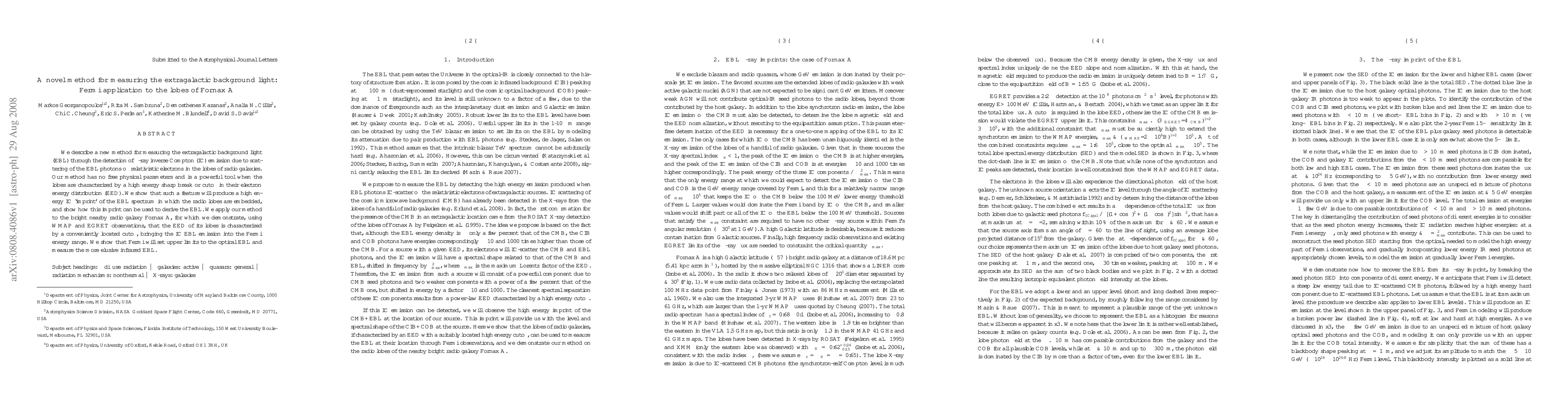We describe a new method for measuring the extragalactic background light (EBL) through the detection of $\gamma$-ray inverse Compton (IC) emission due to scattering of the EBL photons off relativistic electrons in the lobes of radio galaxies. Our method has no free physical parameters and is a powerful tool when the lobes are characterized by a high energy sharp break or cutoff in their electron energy distribution (EED). We show that such a feature will produce a high energy IC `imprint' of the EBL spectrum in which the radio lobes are embedded, and show how this imprint can be used to derive the EBL. We apply our method to the bright nearby radio galaxy Fornax A, for which we demonstrate, using WMAP and EGRET observations, that the EED of its lobes is characterized by a conveniently located cutoff, bringing the IC EBL emission into the {\sl Fermi} energy range. We show that {\sl Fermi} will set upper limits to the optical EBL and measure the more elusive infrared EBL.