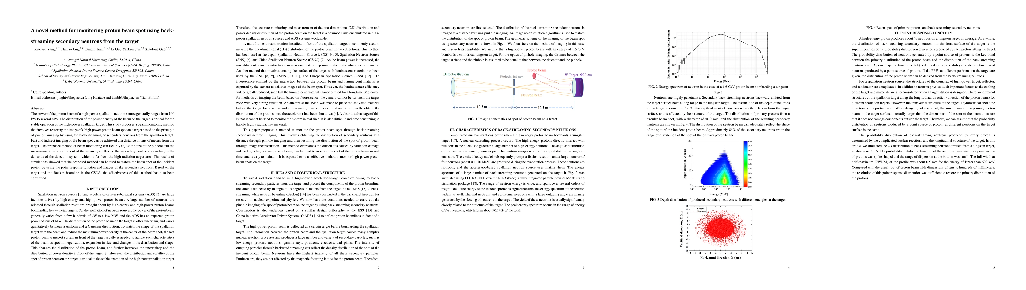 This paper proposes a novel method for monitoring high-power proton beam spots using back-streaming secondary neutrons from the target, employing pinhole imaging for fast and indirect beam spot imaging at a safe distance. The method's effectiveness has been confirmed through simulations and practical tests on the CSNS facility.