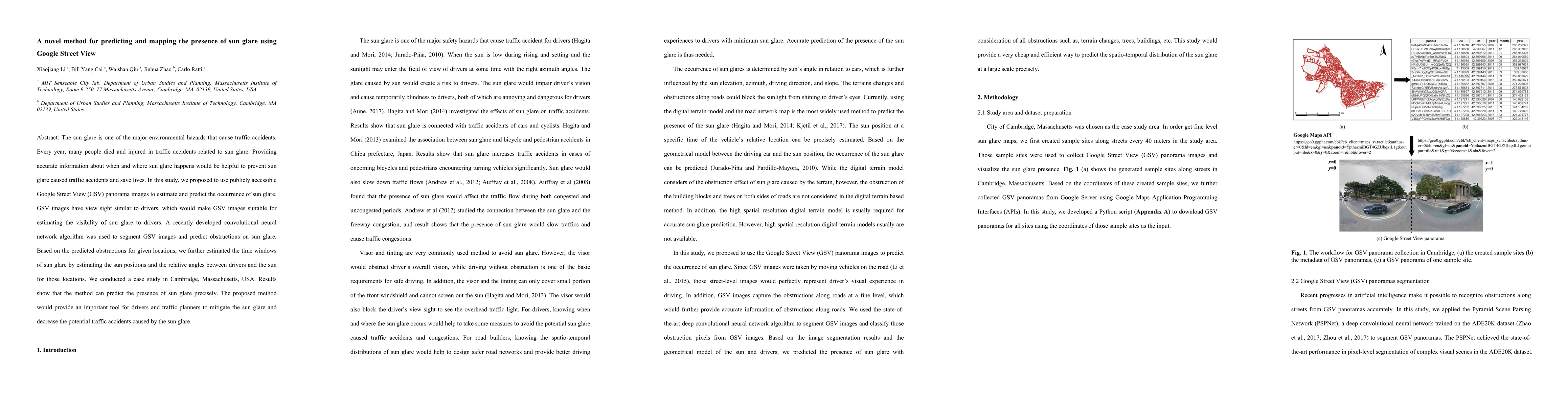 This paper proposes a novel method using Google Street View images and a convolutional neural network to predict and map sun glare occurrences, aiming to prevent traffic accidents caused by sun glare. The method estimates sun glare visibility and time windows based on sun positions and relative angles, demonstrating precise predictions in a case study in Cambridge, Massachusetts.