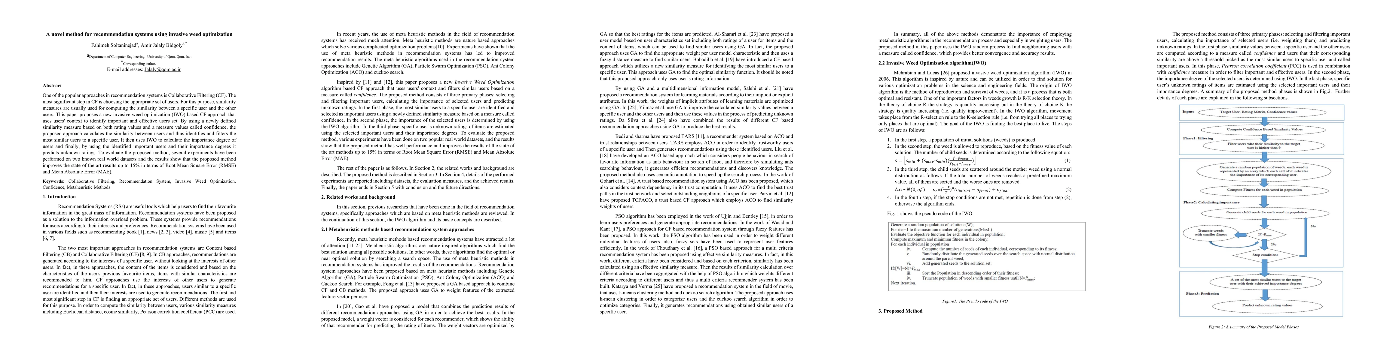 A new approach to recommendation systems uses invasive weed optimization to identify important users based on similarity measures that consider both rating values and confidence. The method improves state-of-the-art results by up to 15% in terms of accuracy.