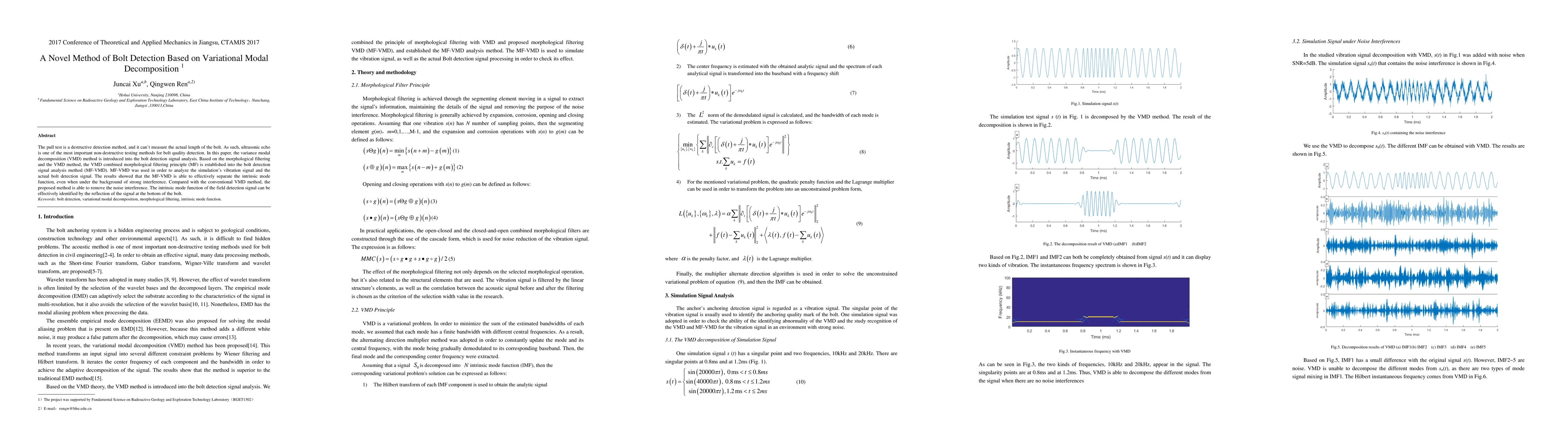 The pull test is a destructive detection method, and it can t measure the actual length of the bolt. As such, ultrasonic echo is one of the most important non-destructive testing methods for bolt quality detection. In this paper, the variance modal decomposition method is introduced into the bolt detection signal analysis. Based on the morphological filtering and the VMD method, the VMD combined morphological filtering principle is established into the bolt detection signal analysis method. MF-VMD was used in order to analyze the simulation vibration signal and the actual bolt detection signal. The results showed that the MF-VMD is able to effectively separate the intrinsic mode function, even when under the background of strong interference. Compared with the conventional VMD method, the proposed method is able to remove the noise interference. The intrinsic mode function of the field detection signal can be effectively identified by the reflection of the signal at the bottom of the bolt.