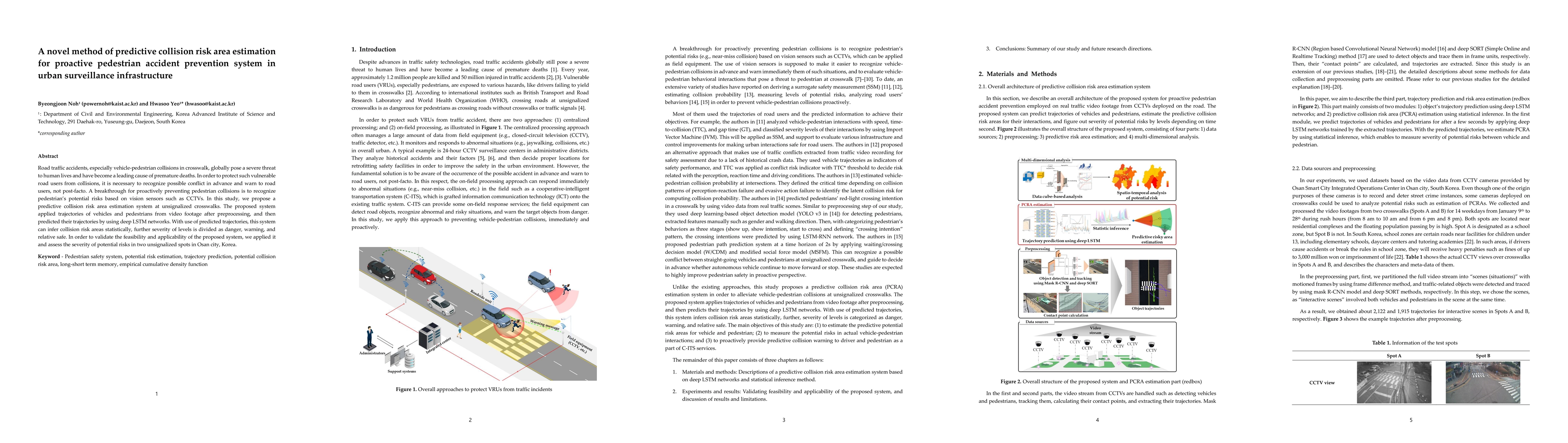 A new system predicts pedestrian collision risk areas at unsignalized crosswalks using video footage and deep learning algorithms. The system can divide risks into danger, warning, or safe levels to help prevent accidents.