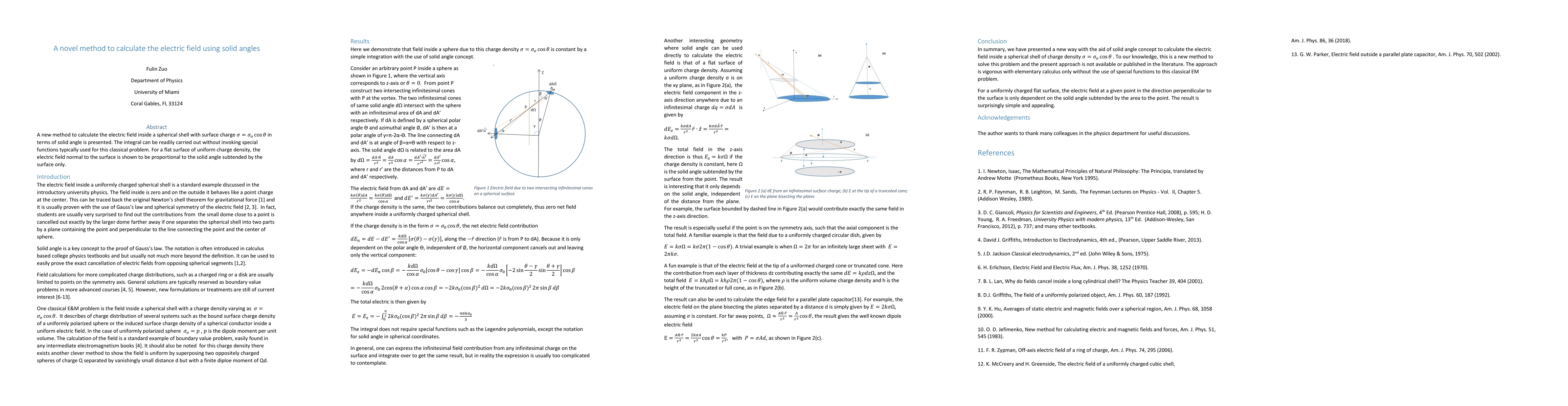 A new method to calculate the electric field inside a spherical shell with surface charge in terms of solid angle is presented. The integral can be readily carried out without invoking special functions typically used for this classical problem. For a flat surface of uniform charge density, the electric field normal to the surface is shown to be proportional to the solid angle subtended by the surface only.