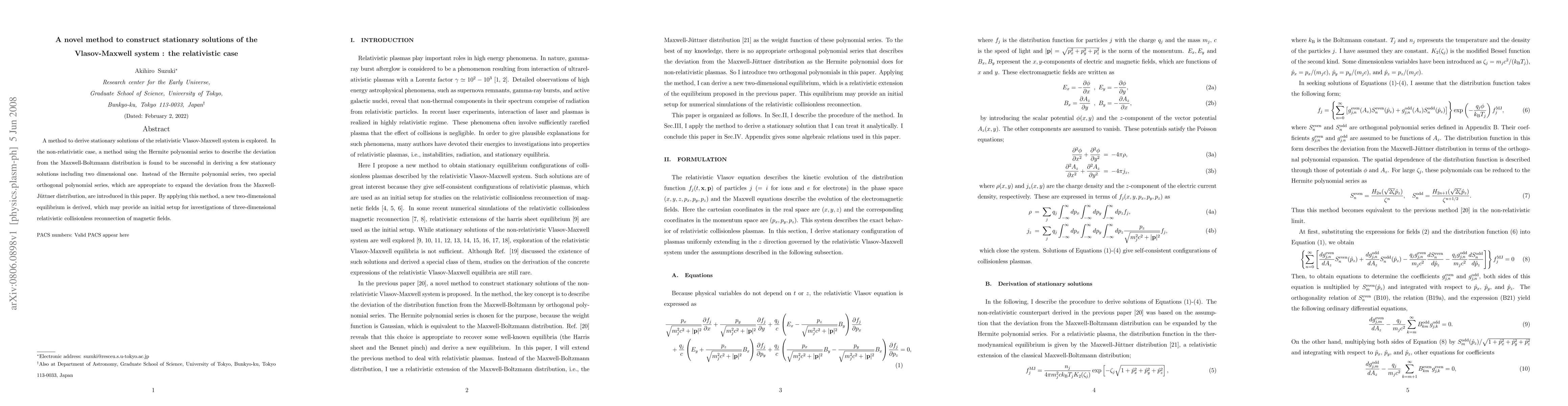 A method to derive stationary solutions of the relativistic Vlasov-Maxwell system is explored. In the non-relativistic case, a method using the Hermite polynomial series to describe the deviation from the Maxwell-Boltzmann distribution is found to be successful in deriving a few stationary solutions including two dimensional one. Instead of the Hermite polynomial series, two special orthogonal polynomial series, which are appropriate to expand the deviation from the Maxwell-J\"uttner distribution, are introduced in this paper. By applying this method, a new two-dimensional equilibrium is derived, which may provide an initial setup for investigations of three-dimensional relativistic collisionless reconnection of magnetic fields.