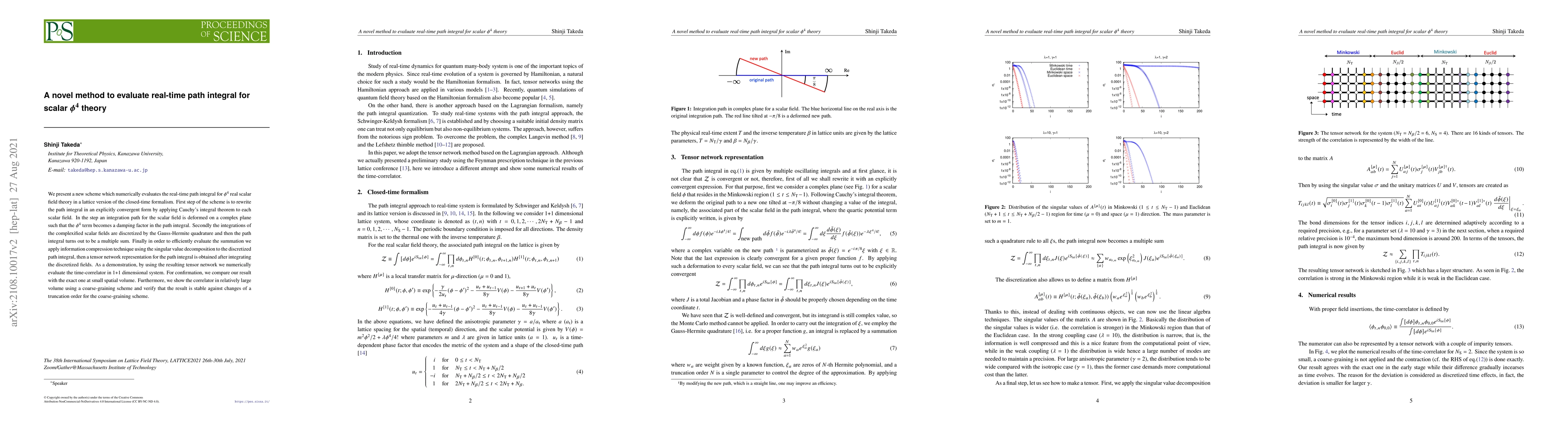 We present a new scheme which numerically evaluates the real-time path integral for $\phi^4$ real scalar field theory in a lattice version of the closed-time formalism. First step of the scheme is to rewrite the path integral in an explicitly convergent form by applying Cauchy's integral theorem to each scalar field. In the step an integration path for the scalar field is deformed on a complex plane such that the $\phi^4$ term becomes a damping factor in the path integral. Secondly the integrations of the complexified scalar fields are discretized by the Gauss-Hermite quadrature and then the path integral turns out to be a multiple sum. Finally in order to efficiently evaluate the summation we apply information compression technique using the singular value decomposition to the discretized path integral, then a tensor network representation for the path integral is obtained after integrating the discretized fields. As a demonstration, by using the resulting tensor network we numerically evaluate the time-correlator in 1+1 dimensional system. For confirmation, we compare our result with the exact one at small spatial volume. Furthermore, we show the correlator in relatively large volume using a coarse-graining scheme and verify that the result is stable against changes of a truncation order for the coarse-graining scheme.