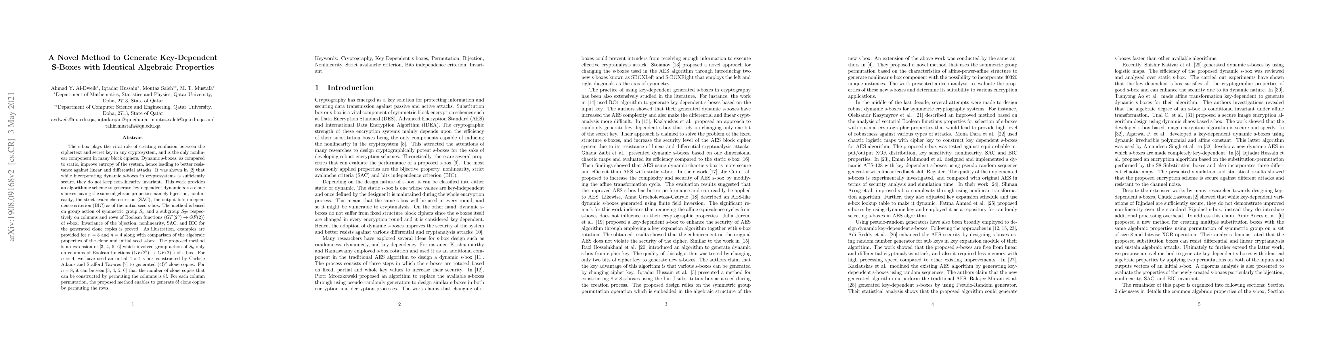 The s-box plays the vital role of creating confusion between the ciphertext and secret key in any cryptosystem, and is the only nonlinear component in many block ciphers. Dynamic s-boxes, as compared to static, improve entropy of the system, hence leading to better resistance against linear and differential attacks. It was shown in [2] that while incorporating dynamic s-boxes in cryptosystems is sufficiently secure, they do not keep non-linearity invariant. This work provides an algorithmic scheme to generate key-dependent dynamic $n\times n$ clone s-boxes having the same algebraic properties namely bijection, nonlinearity, the strict avalanche criterion (SAC), the output bits independence criterion (BIC) as of the initial seed s-box. The method is based on group action of symmetric group $S_n$ and a subgroup $S_{2^n}$ respectively on columns and rows of Boolean functions ($GF(2^n)\to GF(2)$) of s-box. Invariance of the bijection, nonlinearity, SAC, and BIC for the generated clone copies is proved. As illustration, examples are provided for $n=8$ and $n=4$ along with comparison of the algebraic properties of the clone and initial seed s-box. The proposed method is an extension of [3,4,5,6] which involved group action of $S_8$ only on columns of Boolean functions ($GF(2^8)\to GF(2)$ ) of s-box. For $n=4$, we have used an initial $4\times 4$ s-box constructed by Carlisle Adams and Stafford Tavares [7] to generated $(4!)^2$ clone copies. For $n=8$, it can be seen [3,4,5,6] that the number of clone copies that can be constructed by permuting the columns is $8!$. For each column permutation, the proposed method enables to generate $8!$ clone copies by permuting the rows.