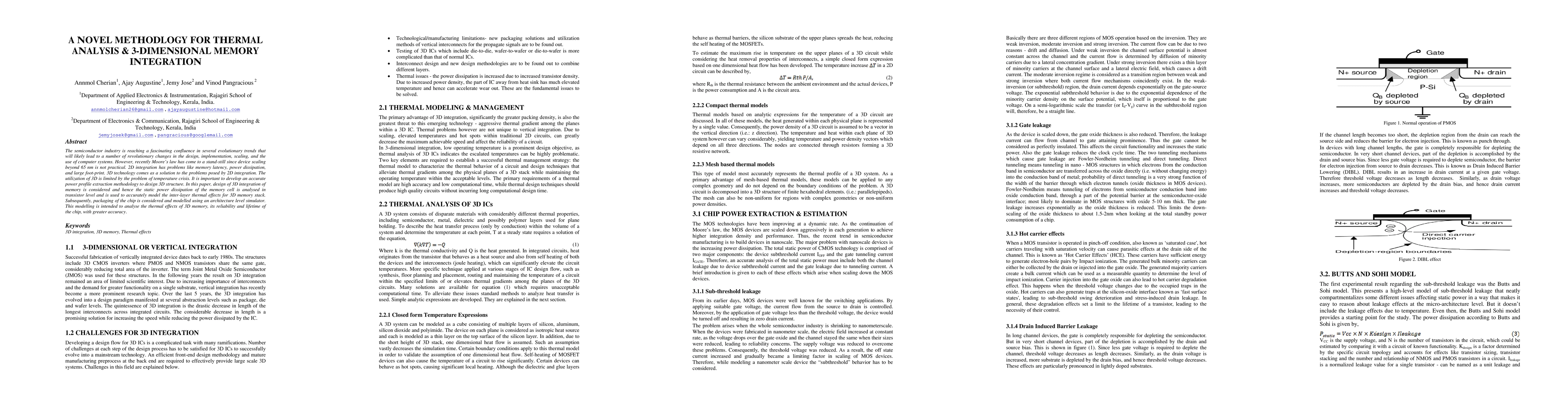 The semiconductor industry is reaching a fascinating confluence in several evolutionary trends that will likely lead to a number of revolutionary changes in the design, implementation, scaling, and the use of computer systems. However, recently Moore's law has come to a stand-still since device scaling beyond 65 nm is not practical. 2D integration has problems like memory latency, power dissipation, and large foot-print. 3D technology comes as a solution to the problems posed by 2D integration. The utilization of 3D is limited by the problem of temperature crisis. It is important to develop an accurate power profile extraction methodology to design 3D structure. In this paper, design of 3D integration of memory is considered and hence the static power dissipation of the memory cell is analysed in transistor level and is used to accurately model the inter-layer thermal effects for 3D memory stack. Subsequently, packaging of the chip is considered and modelled using an architecture level simulator. This modelling is intended to analyse the thermal effects of 3D memory, its reliability and lifetime of the chip, with greater accuracy.