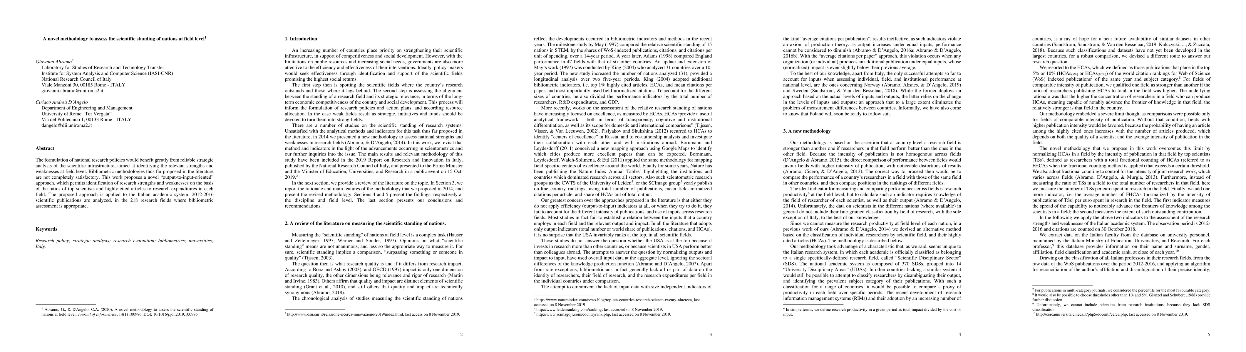 This paper introduces a new "output-to-input-oriented" bibliometric methodology to assess the scientific standing of nations at the field level, evaluating strengths and weaknesses based on ratios of top scientists and highly cited articles to research expenditures. The approach is applied to the Italian academic system for 2012-2016 publications across 218 research fields.