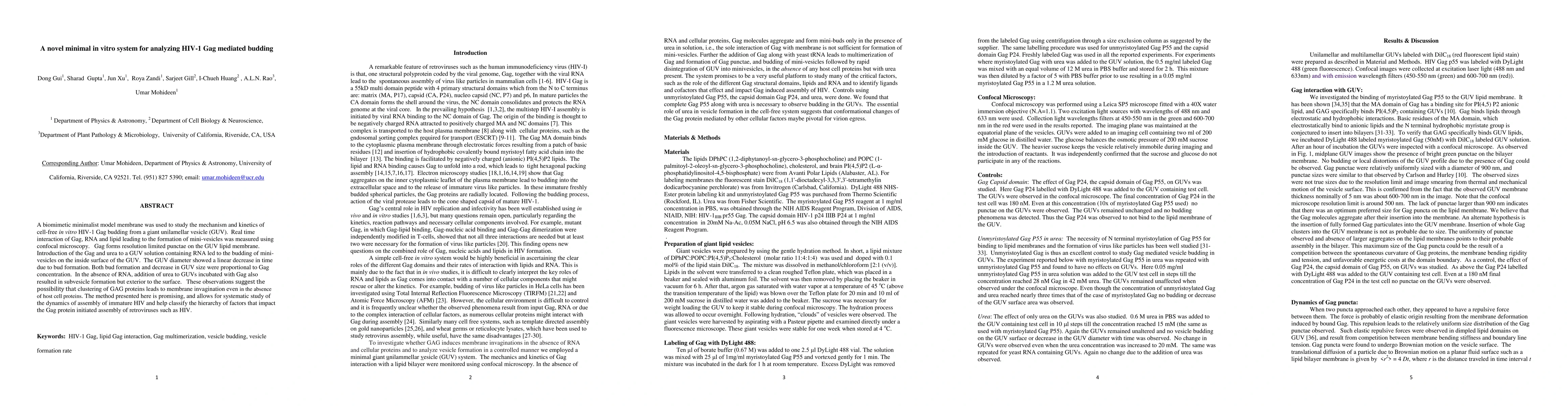 A biomimetic minimalist model membrane was used to study the mechanism and kinetics of cell-free in vitro HIV-1 Gag budding from a giant unilamellar vesicle (GUV). Real time interaction of Gag, RNA and lipid leading to the formation of mini-vesicles was measured using confocal microscopy. Gag forms resolution limited punctae on the GUV lipid membrane. Introduction of the Gag and urea to a GUV solution containing RNA led to the budding of mini-vesicles on the inside surface of the GUV. The GUV diameter showed a linear decrease in time due to bud formation. Both bud formation and decrease in GUV size were proportional to Gag concentration. In the absence of RNA, addition of urea to GUVs incubated with Gag also resulted in subvesicle formation but exterior to the surface. These observations suggest the possibility that clustering of GAG proteins leads to membrane invagination even in the absence of host cell proteins. The method presented here is promising, and allows for systematic study of the dynamics of assembly of immature HIV and help classify the hierarchy of factors that impact the Gag protein initiated assembly of retroviruses such as HIV.