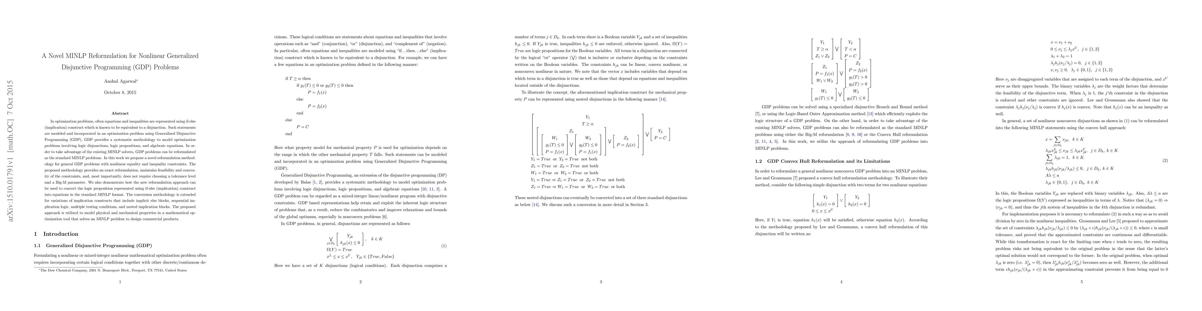 In optimization problems, often equations and inequalities are represented using if-else (implication) construct which is known to be equivalent to a disjunction. Such statements are modeled and incorporated in an optimization problem using Generalized Disjunctive Programming (GDP). GDP provides a systematic methodology to model optimization problems involving logic disjunctions, logic propositions, and algebraic equations. In order to take advantage of the existing MINLP solvers, GDP problems can be reformulated as the standard MINLP problems. In this work we propose a novel reformulation methodology for general GDP problems with nonlinear equality and inequality constraints. The proposed methodology provides an exact reformulation, maintains feasibility and convexity of the constraints, and, most importantly, does not require choosing a tolerance level and a Big-M parameter. We also demonstrate how the new reformulation approach can be used to convert the logic proposition represented using if-else (implication) construct into equations in the standard MINLP format. The conversion methodology is extended for variations of implication constructs that include implicit else blocks, sequential implication logic, multiple testing conditions, and nested implication blocks. The proposed approach is utilized to model physical and mechanical properties in a mathematical optimization tool that solves an MINLP problem to design commercial products.