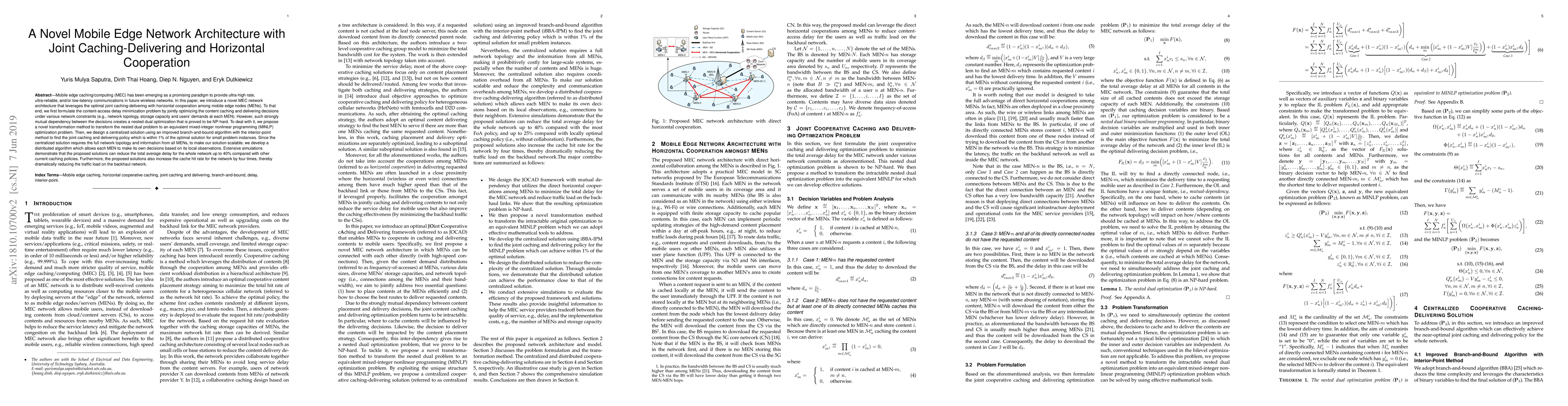 This paper introduces a novel mobile edge caching architecture called JOCAD that optimizes joint caching-delivering and horizontal cooperation among mobile edge nodes to reduce average delay and backhaul traffic. Simulation results show up to 40% reduction in delay compared to frequency-based policies and a fourfold increase in cache hit rate.