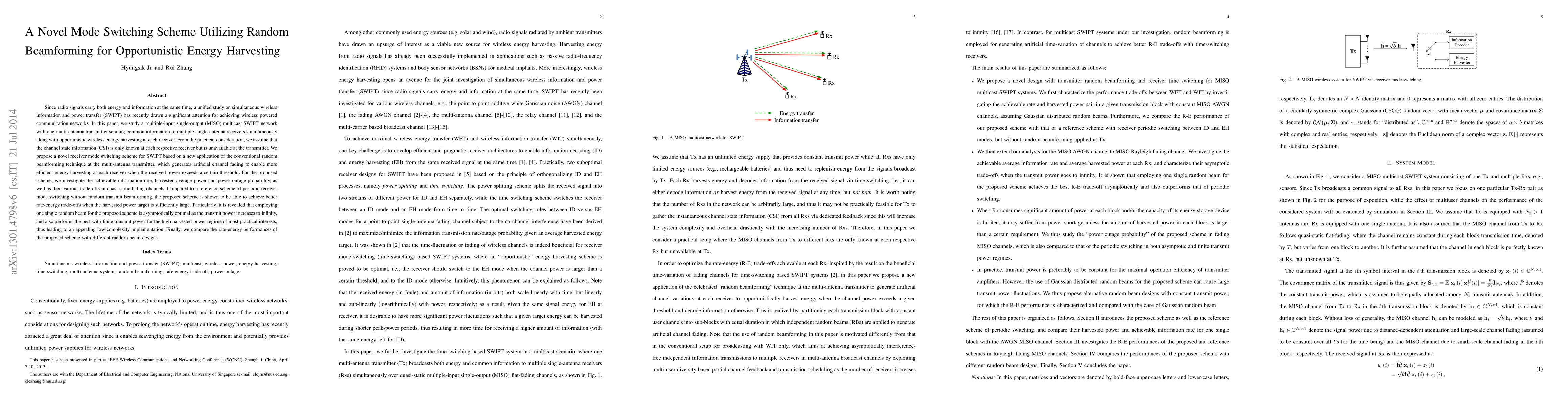 Since radio signals carry both energy and information at the same time, a unified study on simultaneous wireless information and power transfer (SWIPT) has recently drawn a significant attention for achieving wireless powered communication networks. In this paper, we study a multiple-input single-output (MISO) multicast SWIPT network with one multi-antenna transmitter sending common information to multiple single-antenna receivers simultaneously along with opportunistic wireless energy harvesting at each receiver. From the practical consideration, we assume that the channel state information (CSI) is only known at each respective receiver but is unavailable at the transmitter. We propose a novel receiver mode switching scheme for SWIPT based on a new application of the conventional random beamforming technique at the multi-antenna transmitter, which generates artificial channel fading to enable more efficient energy harvesting at each receiver when the received power exceeds a certain threshold. For the proposed scheme, we investigate the achievable information rate, harvested average power and/or power outage probability, as well as their various trade-offs in both AWGN and quasi-static fading channels. Compared to a reference scheme of periodic receiver mode switching without random transmit beamforming, the proposed scheme is shown to be able to achieve better rate-energy trade-offs when the harvested energy target is sufficiently large. Particularly, it is revealed that employing one single random beam for the proposed scheme is asymptotically optimal as the transmit power increases to infinity, and also performs the best with finite transmit power for the high harvested energy regime of most practical interests, thus leading to an appealing low-complexity implementation. Finally, we compare the rate-energy performances of the proposed scheme with different random beam designs.