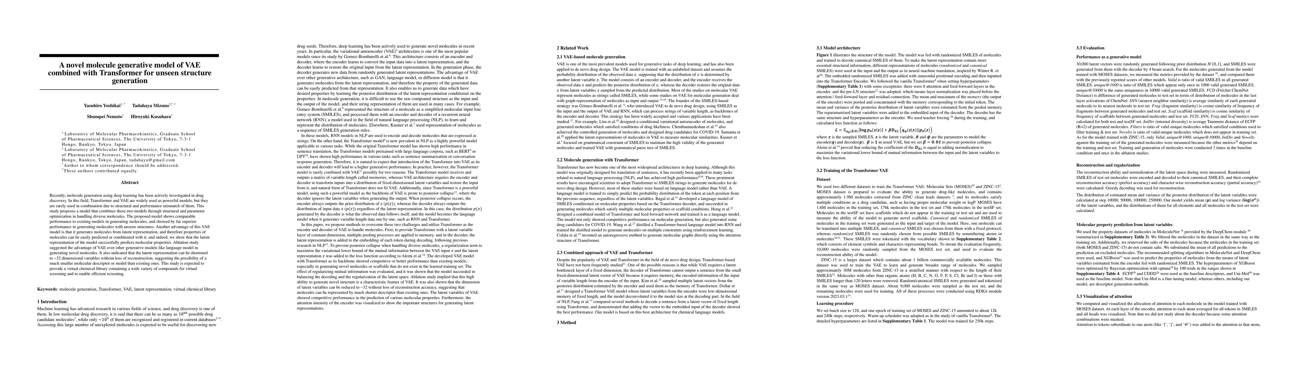 Recently, molecule generation using deep learning has been actively investigated in drug discovery. In this field, Transformer and VAE are widely used as powerful models, but they are rarely used in combination due to structural and performance mismatch of them. This study proposes a model that combines these two models through structural and parameter optimization in handling diverse molecules. The proposed model shows comparable performance to existing models in generating molecules, and showed by far superior performance in generating molecules with unseen structures. Another advantage of this VAE model is that it generates molecules from latent representation, and therefore properties of molecules can be easily predicted or conditioned with it, and indeed, we show that the latent representation of the model successfully predicts molecular properties. Ablation study suggested the advantage of VAE over other generative models like language model in generating novel molecules. It also indicated that the latent representation can be shortened to ~32 dimensional variables without loss of reconstruction, suggesting the possibility of a much smaller molecular descriptor or model than existing ones. This study is expected to provide a virtual chemical library containing a wide variety of compounds for virtual screening and to enable efficient screening.