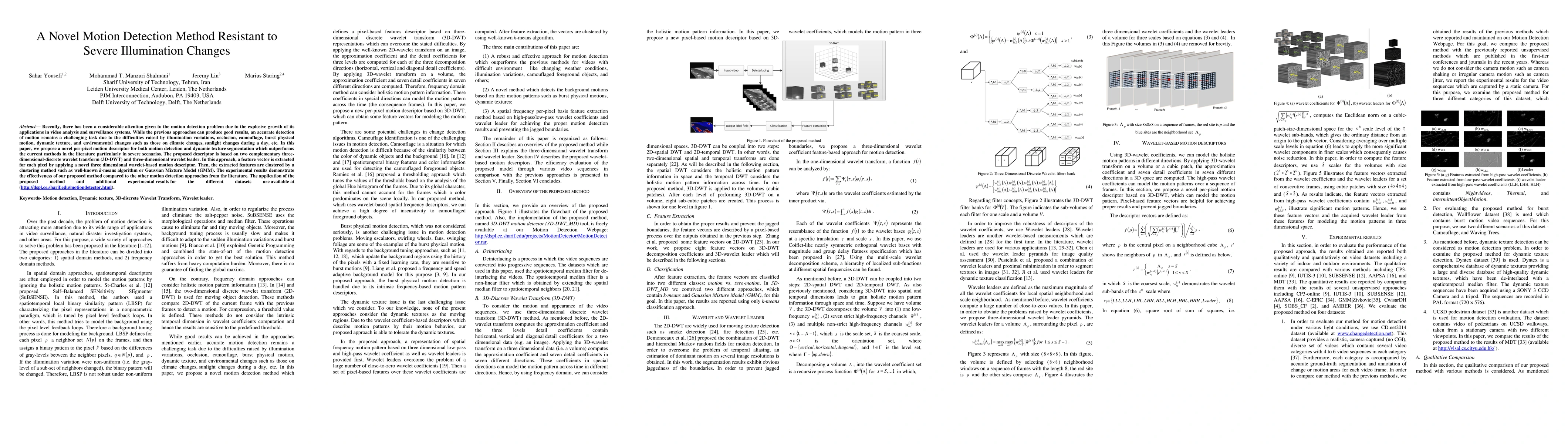 Recently, there has been a considerable attention given to the motion detection problem due to the explosive growth of its applications in video analysis and surveillance systems. While the previous approaches can produce good results, an accurate detection of motion remains a challenging task due to the difficulties raised by illumination variations, occlusion, camouflage, burst physical motion, dynamic texture, and environmental changes such as those on climate changes, sunlight changes during a day, etc. In this paper, we propose a novel per-pixel motion descriptor for both motion detection and dynamic texture segmentation which outperforms the current methods in the literature particularly in severe scenarios. The proposed descriptor is based on two complementary three-dimensional-discrete wavelet transform (3D-DWT) and three-dimensional wavelet leader. In this approach, a feature vector is extracted for each pixel by applying a novel three dimensional wavelet-based motion descriptor. Then, the extracted features are clustered by a clustering method such as well-known k-means algorithm or Gaussian Mixture Model (GMM). The experimental results demonstrate the effectiveness of our proposed method compared to the other motion detection approaches from the literature. The application of the proposed method and additional experimental results for the different datasets are available at (http://dspl.ce.sharif.edu/motiondetector.html).