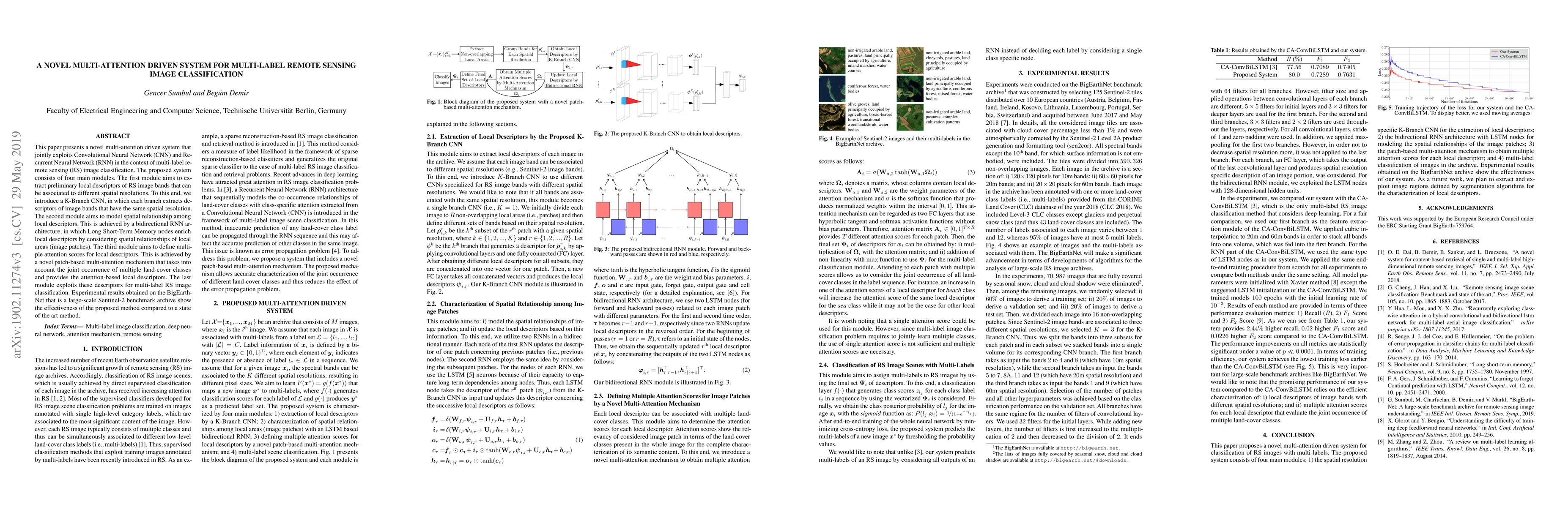 This paper introduces a multi-attention driven system for multi-label remote sensing image classification, combining CNN and RNN to extract and model spatial relationships in image bands. The system's effectiveness is demonstrated through superior performance on the BigEarthNet benchmark.