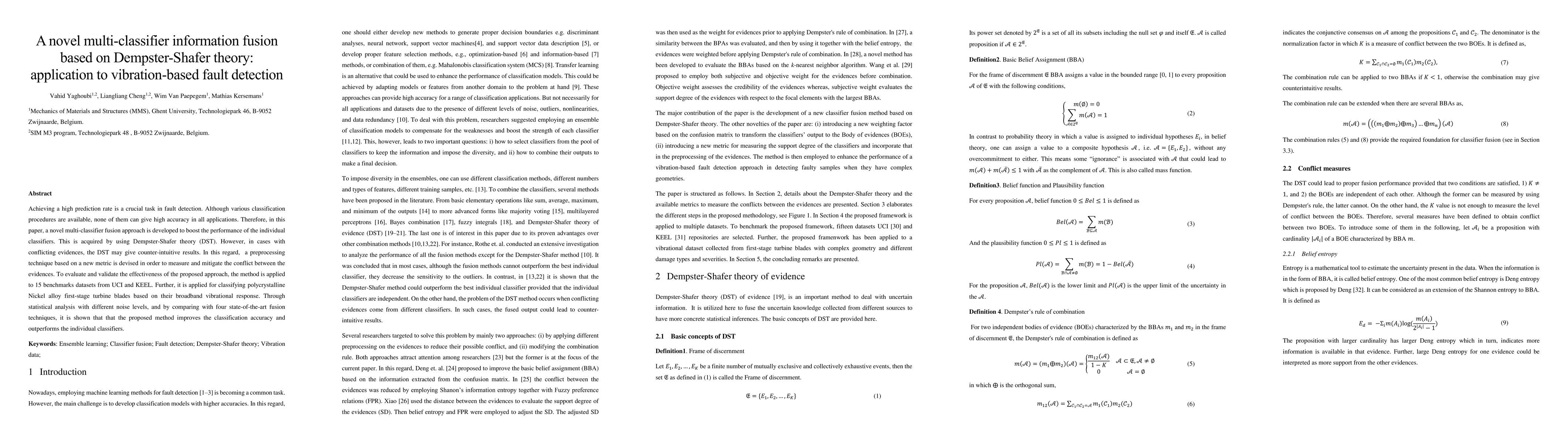 This paper proposes a novel multi-classifier fusion method based on Dempster-Shafer theory to enhance fault detection accuracy. It introduces a preprocessing technique to mitigate conflicts in evidence, and demonstrates its effectiveness through applications on benchmark datasets and vibration-based fault detection of turbine blades, outperforming existing fusion techniques.
