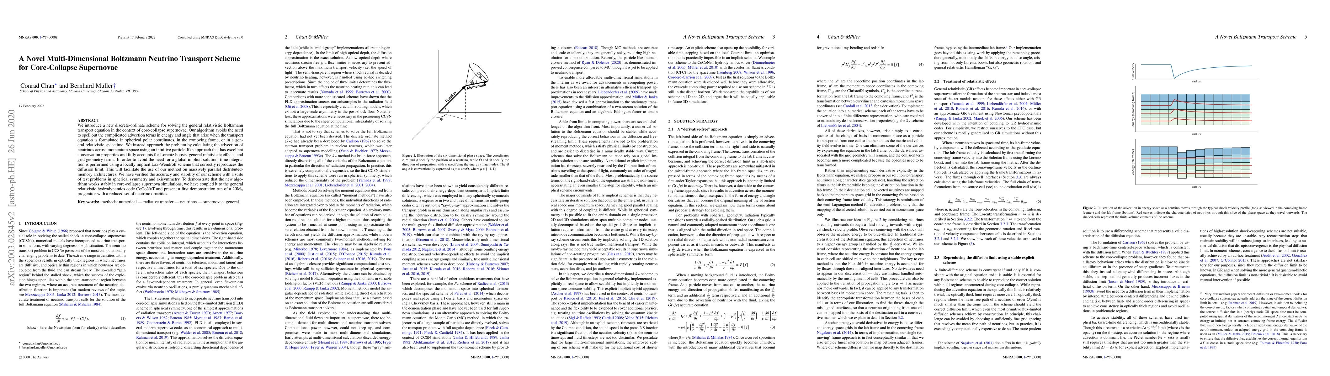 This paper introduces a novel multi-dimensional Boltzmann neutrino transport scheme for core-collapse supernovae, employing a discrete-ordinate method to solve the general relativistic transport equation without complex advection terms. The method uses a particle-like approach for advection, ensuring excellent conservation and relativistic effects, and is verified for accuracy and stability through test problems and coupled simulations with a hydrodynamics code.