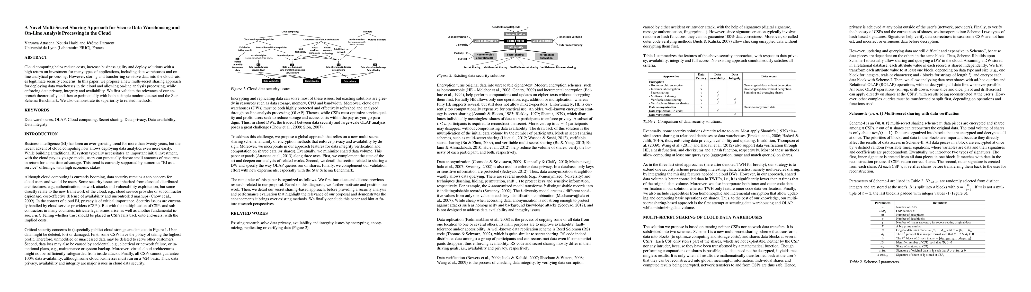 This paper proposes a novel multi-secret sharing method to secure sensitive data in cloud-based data warehouses and online analytical processing, ensuring data privacy, integrity, and availability. The approach is validated both theoretically and experimentally using a random dataset and the Star Schema Benchmark, demonstrating its effectiveness over existing methods.
