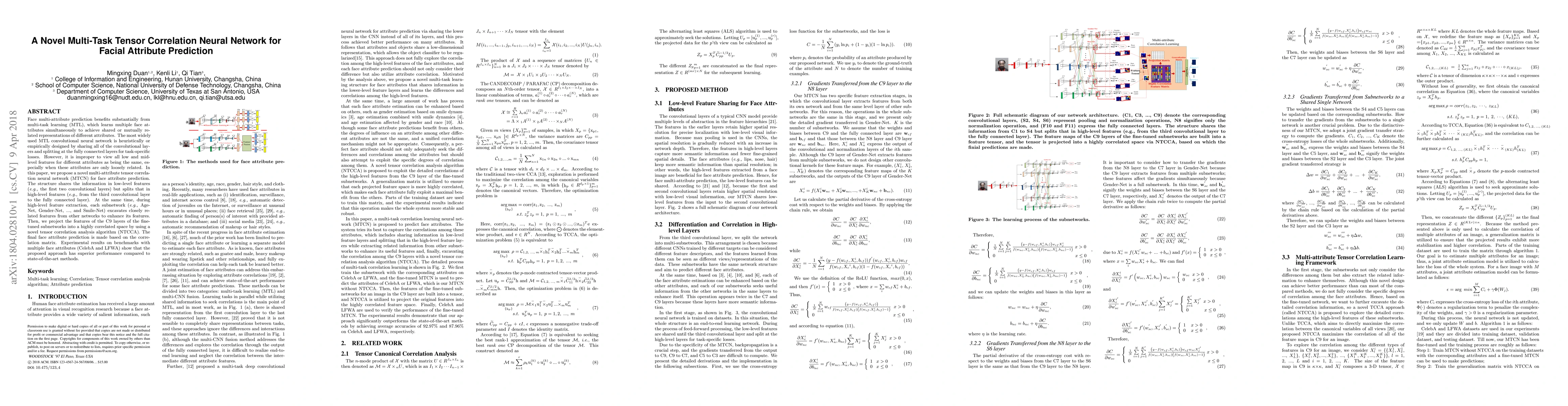 This paper introduces a novel multi-task tensor correlation neural network (MTCN) for predicting multiple facial attributes. It shares low-level features while allowing high-level features to correlate across subnetworks, enhancing performance through a tensor correlation analysis algorithm (NTCCA). Experimental results demonstrate superior performance over existing methods on benchmark datasets.