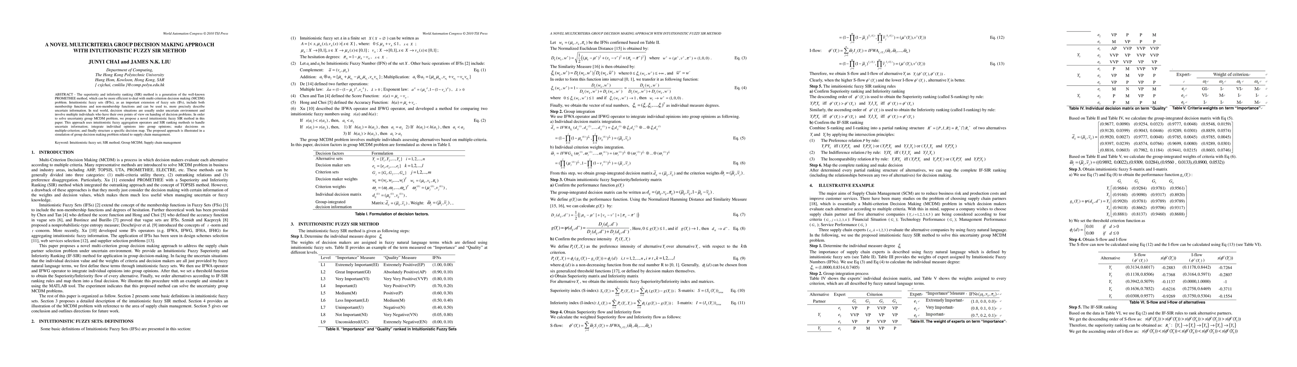 This paper proposes a novel multicriteria group decision making approach using the Intuitionistic Fuzzy SIR method, combining intuitionistic fuzzy aggregation operators and superiority and inferiority ranking to handle uncertain information, integrate individual opinions into group decisions, and structure a specific decision map for supply chain management scenarios.