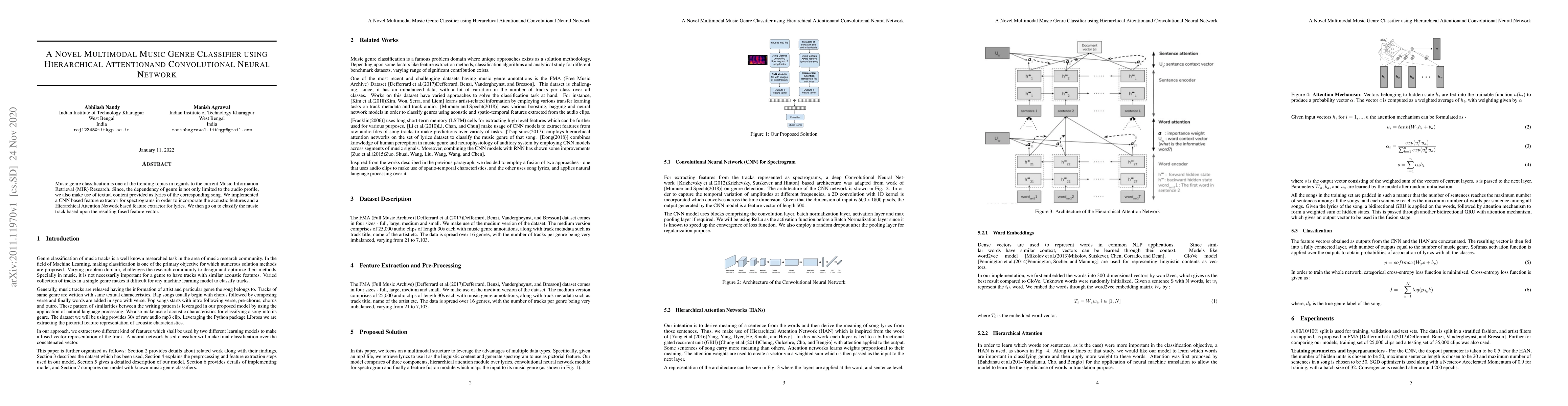 This paper proposes a novel multimodal music genre classifier that combines Convolutional Neural Networks for acoustic features and a Hierarchical Attention Network for textual lyrics to enhance classification accuracy. The fused feature vector from both modalities is used for final genre classification.