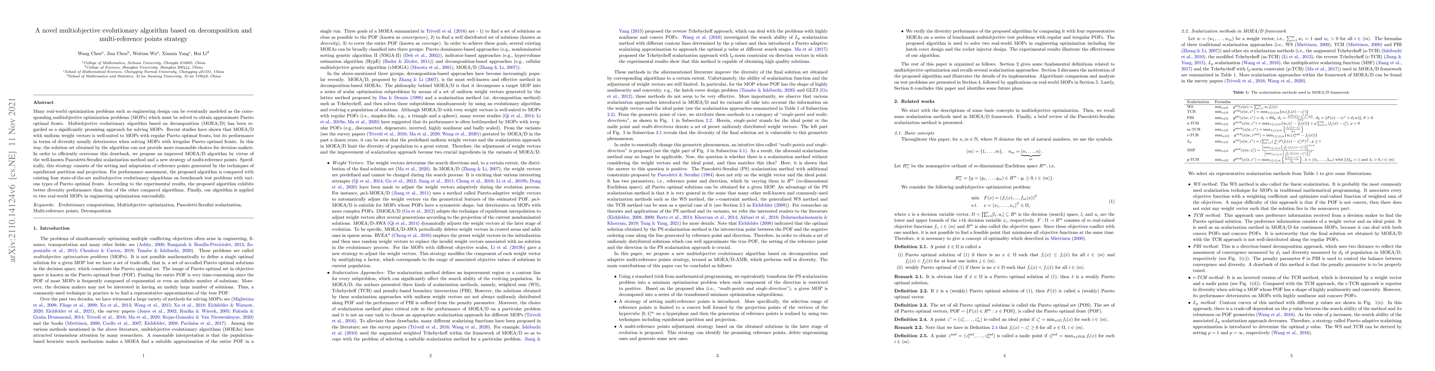 This paper proposes an enhanced multiobjective evolutionary algorithm (MOEA/D) using decomposition and a multi-reference points strategy to improve diversity performance in solving irregular Pareto optimal fronts. The new approach outperforms existing algorithms, as demonstrated through benchmark tests and real-world engineering optimization problems.