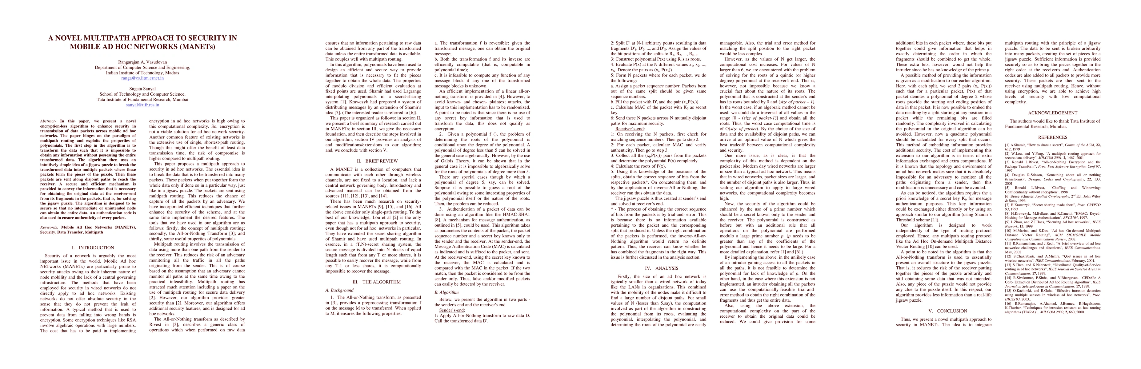 In this paper, we present a novel encryption-less algorithm to enhance security in transmission of data packets across mobile ad hoc networks. The paper hinges on the paradigm of multipath routing and exploits the properties of polynomials. The first step in the algorithm is to transform the data such that it is impossible to obtain any information without possessing the entire transformed data. The algorithm then uses an intuitively simple idea of a jigsaw puzzle to break the transformed data into multiple packets where these packets form the pieces of the puzzle. Then these packets are sent along disjoint paths to reach the receiver. A secure and efficient mechanism is provided to convey the information that is necessary for obtaining the original data at the receiver-end from its fragments in the packets, that is, for solving the jigsaw puzzle. The algorithm is designed to be secure so that no intermediate or unintended node can obtain the entire data. An authentication code is also used to ensure authenticity of every packet.