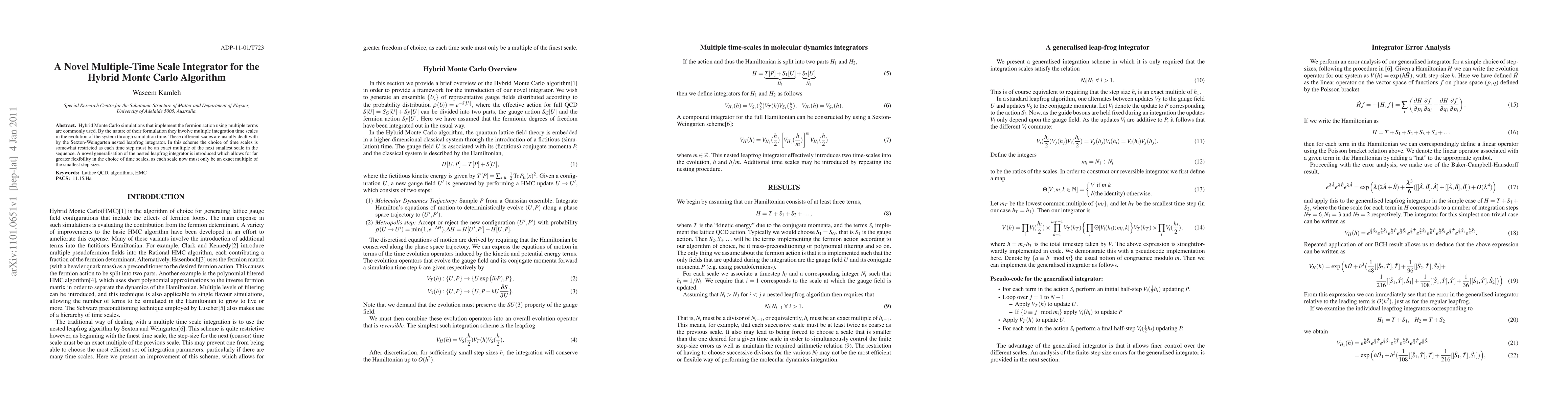 The paper presents a generalized leap-frog integrator for HMC simulations, allowing more flexible choice of integration time scales for different Hamiltonian terms, which is an improvement over the Sexton-Weingarten nested leapfrog integrator.