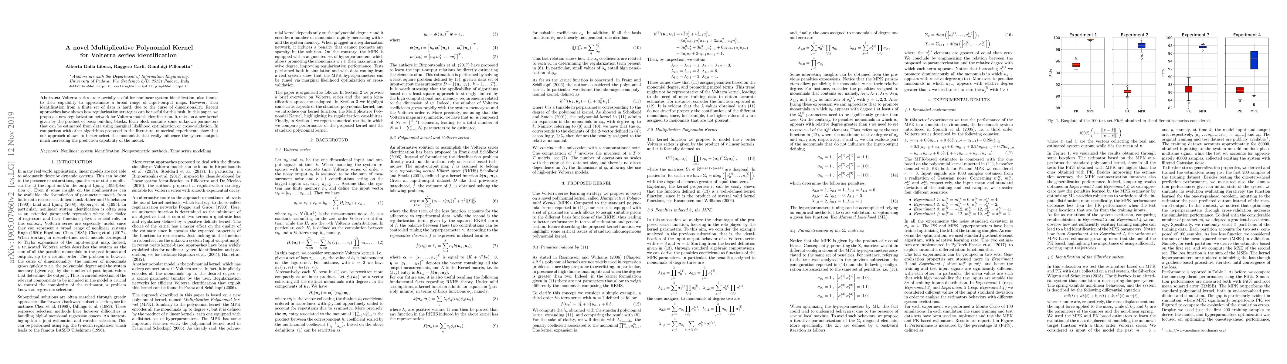 This paper introduces a novel multiplicative polynomial kernel for identifying Volterra series models, which enhances the selection of influential monomials by estimating parameters from data. The proposed regularization network significantly improves prediction capability compared to existing methods.