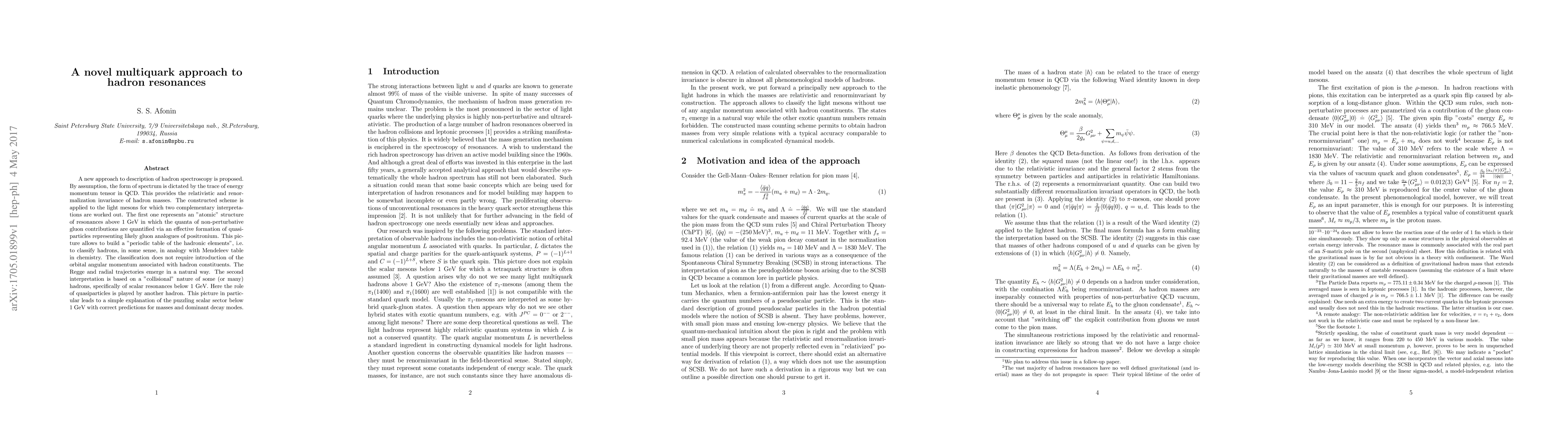 The paper proposes a novel multiquark approach to hadron resonances, interpreting light mesons as 'atomic' structures above 1 GeV with gluon quasiparticles, and as 'collisional' hadrons below 1 GeV, explaining the scalar sector's puzzling behavior and predicting masses and decay modes.