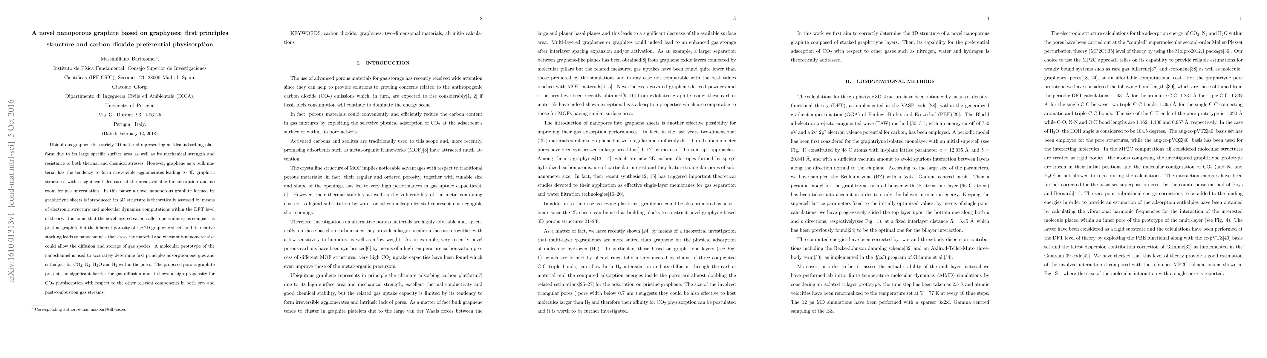 Ubiquitous graphene is a stricly 2D material representing an ideal adsorbing platform due to its large specific surface area as well as its mechanical strength and resistance to both thermal and chemical stresses. However, graphene as a bulk material has the tendency to form irreversible agglomerates leading to 3D graphitic structures with a significant decrease of the area available for adsorption and no room for gas intercalation. In this paper a novel nanoporous graphite formed by graphtriyne sheets is introduced: its 3D structure is theoretically assessed by means of electronic structure and molecular dynamics computations within the DFT level of theory. It is found that the novel layered carbon allotrope is almost as compact as pristine graphite but the inherent porosity of the 2D graphyne sheets and its relative stacking leads to nanochannels that cross the material and whose sub-nanometer size could allow the diffusion and storage of gas species. A molecular prototype of the nanochannel is used to accurately determine first principles adsorption energies and enthalpies for CO2, N2, H2O and H2 within the pores. The proposed porous graphite presents no significant barrier for gas diffusion and it shows a high propensity for CO2 physisorption with respect to the other relevant components in both pre- and post-combustion gas streams.