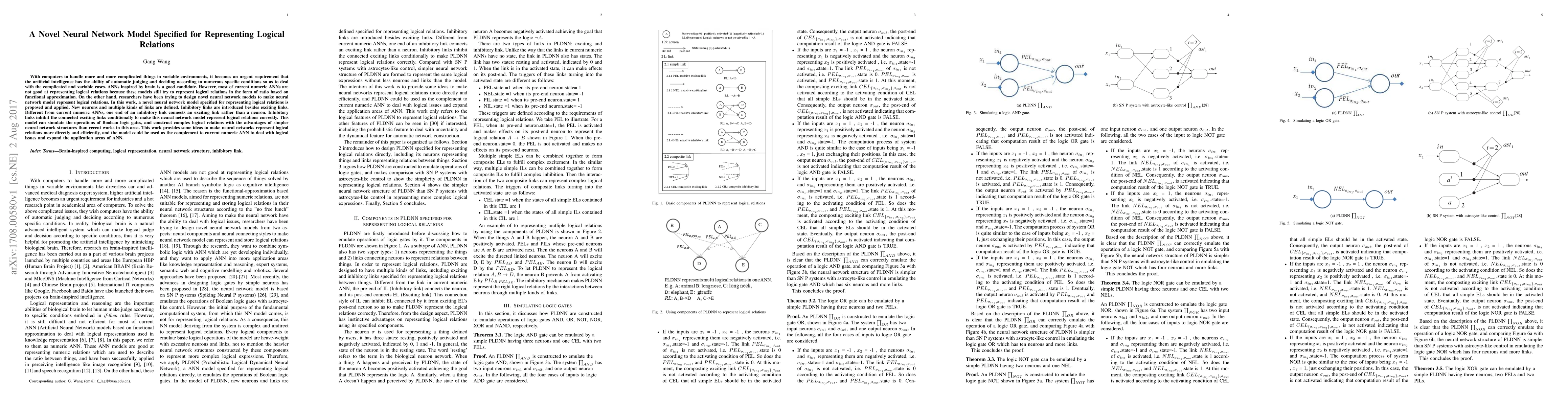 With computers to handle more and more complicated things in variable environments, it becomes an urgent requirement that the artificial intelligence has the ability of automatic judging and deciding according to numerous specific conditions so as to deal with the complicated and variable cases. ANNs inspired by brain is a good candidate. However, most of current numeric ANNs are not good at representing logical relations because these models still try to represent logical relations in the form of ratio based on functional approximation. On the other hand, researchers have been trying to design novel neural network models to make neural network model represent logical relations. In this work, a novel neural network model specified for representing logical relations is proposed and applied. New neurons and multiple kinds of links are defined. Inhibitory links are introduced besides exciting links. Different from current numeric ANNs, one end of an inhibitory link connects an exciting link rather than a neuron. Inhibitory links inhibit the connected exciting links conditionally to make this neural network model represent logical relations correctly. This model can simulate the operations of Boolean logic gates, and construct complex logical relations with the advantages of simpler neural network structures than recent works in this area. This work provides some ideas to make neural networks represent logical relations more directly and efficiently, and the model could be used as the complement to current numeric ANN to deal with logical issues and expand the application areas of ANN.