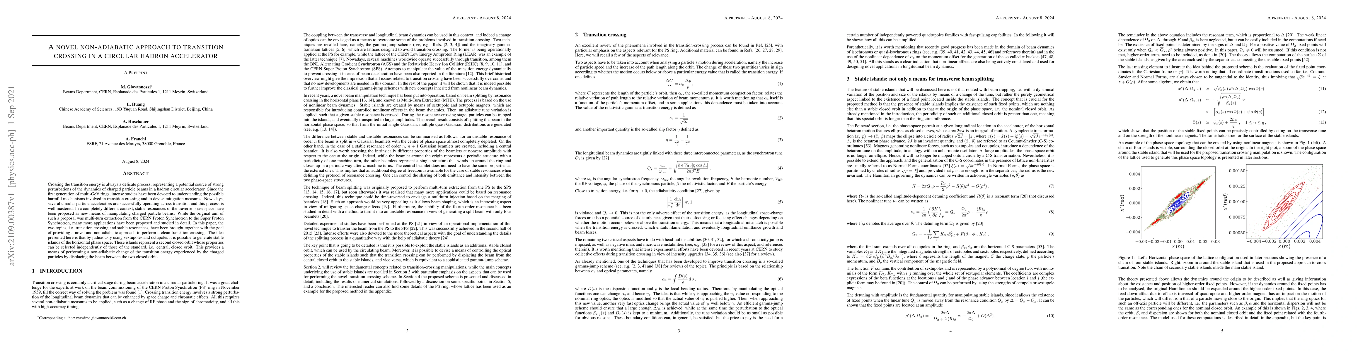 Researchers propose a novel approach to transition crossing in circular hadron accelerators using sextupoles and octupoles to generate stable phase space islands, enabling non-adiabatic changes in transition energy.
