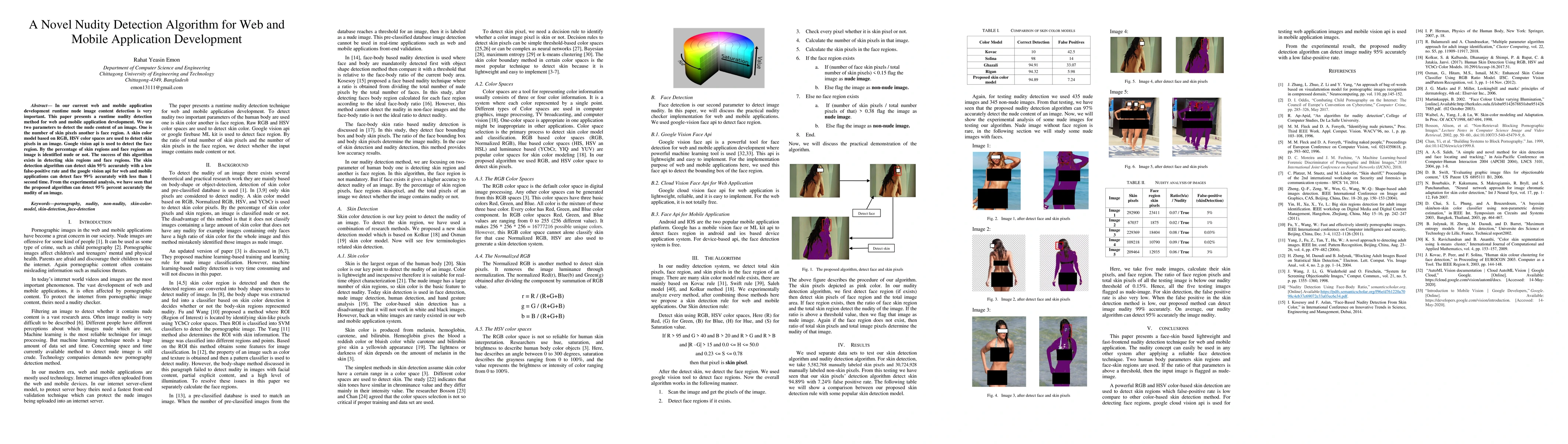 A novel algorithm detects nudity in web and mobile app images with 95% accuracy, using skin pixel detection and Google Vision API for face region detection.