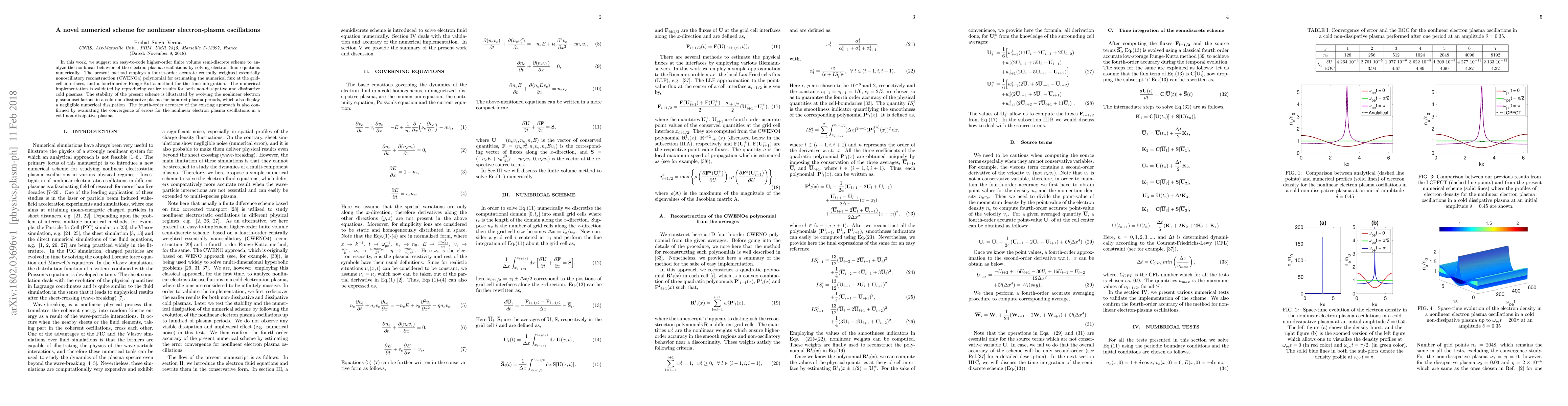 This paper proposes a novel higher-order finite volume scheme for numerically solving nonlinear electron-plasma oscillations using a fourth-order CWENO polynomial and Runge-Kutta method, validated against previous results and demonstrating negligible numerical dissipation.