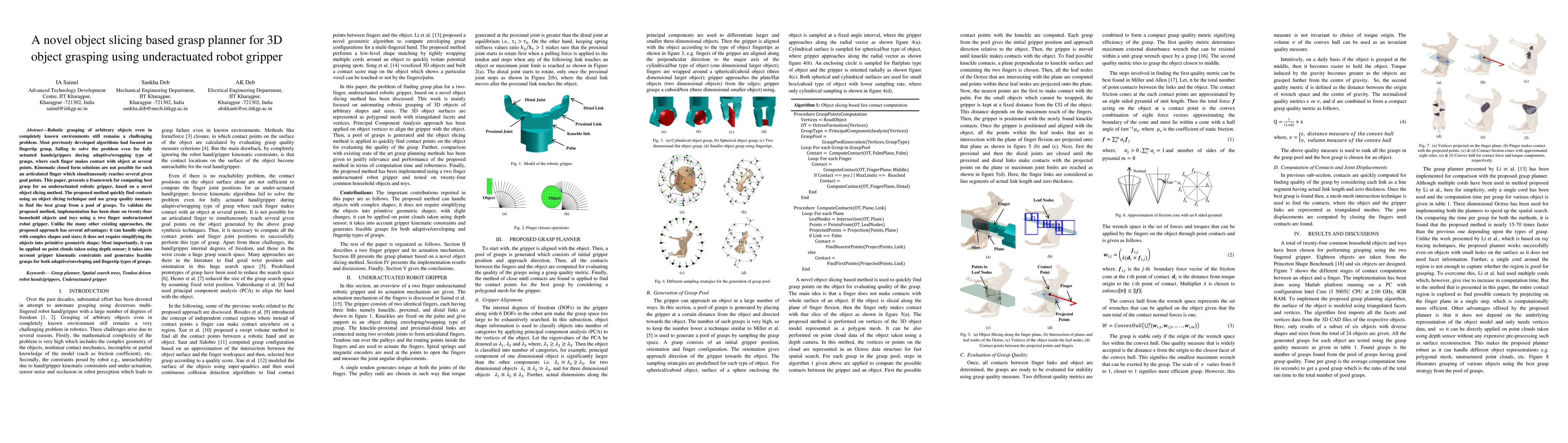 A novel object slicing method is proposed for 3D object grasping using an underactuated robot gripper, enabling the fast generation of grasp quality measures for complex objects with varying shapes and sizes.