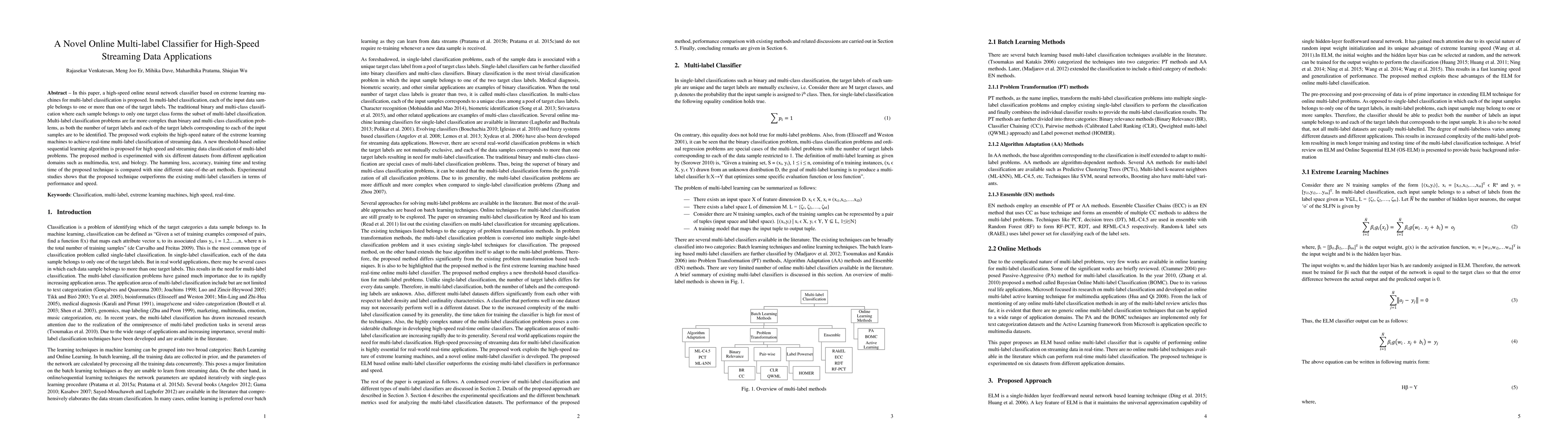 This paper proposes a novel online neural network classifier using extreme learning machines for real-time multi-label classification of high-speed streaming data. The new threshold-based online sequential learning algorithm outperforms existing methods in terms of performance and speed, as demonstrated through experiments on various datasets.