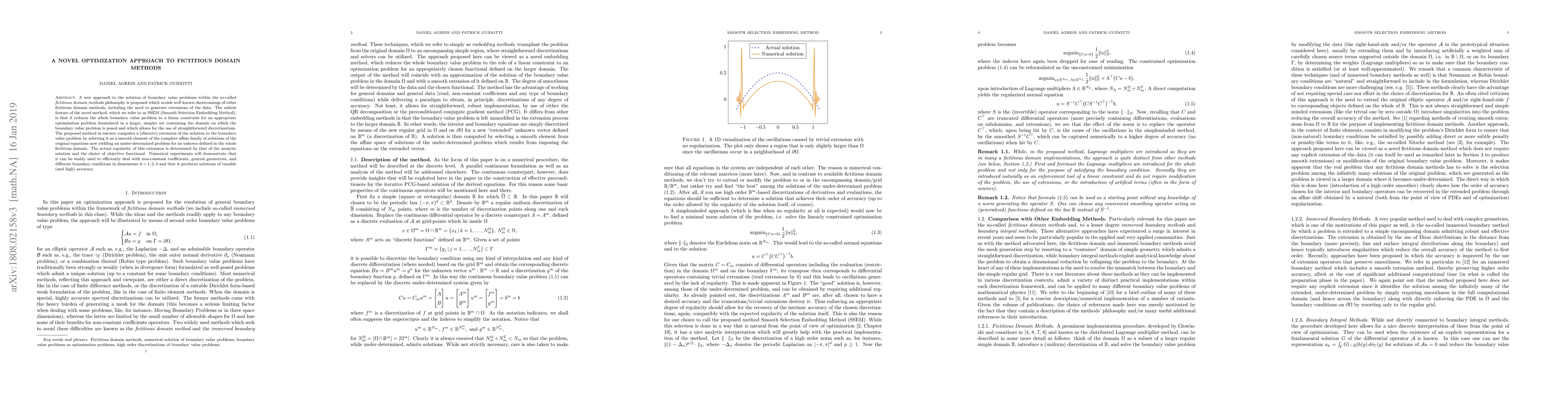 A new approach to the solution of boundary value problems within the so-called fictitious domain methods philosophy is proposed which avoids well known shortcomings of other fictitious domain methods, including the need to generate extensions of the data. The salient feature of the novel method, which we refer to as SSEM (Smooth Selection Embedding Method), is that it reduces the whole boundary value problem to a linear constraint for an appropriate optimization problem formulated in a larger simpler set containing the domain on which the boundary value problem is posed and which allows for the use of straightforward discretizations. The proposed method in essence computes a (discrete) extension of the solution to the boundary value problem by selecting it as a smooth element of the complete affine family of solutions of the extended, yet unmodified, under-determined problem. The actual regularity of this extension is determined by that of the analytic solution and the choice of obejctive functional. Numerical experiments will demonstrate that it can be stably used to efficiently deal with non-constant coefficients, general geometries, and different boundary conditions in dimensions d=1,2,3 and that it produces solutions of tunable (and high) accuracy.